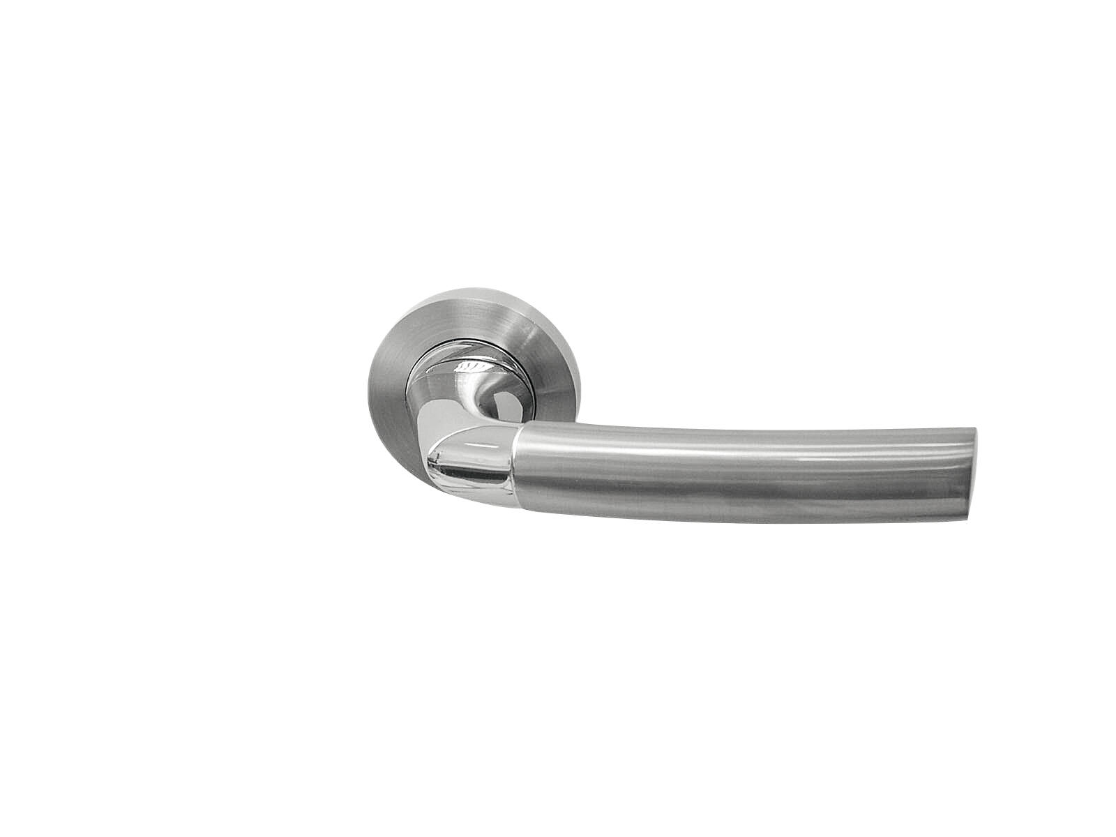 Juego de manillas con roseta para puerta realizada en aluminio y aleación de zinc con acabado níquel satinado y diámetro de 52 mm