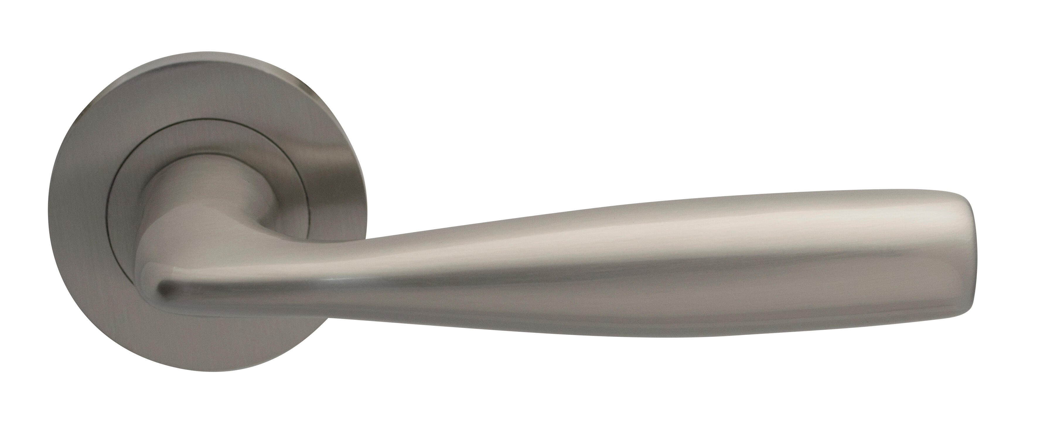 Juego de manilla con roseta para puerta, realizada en aluminio con acabado níquel satinado de 52 mm de diámetro