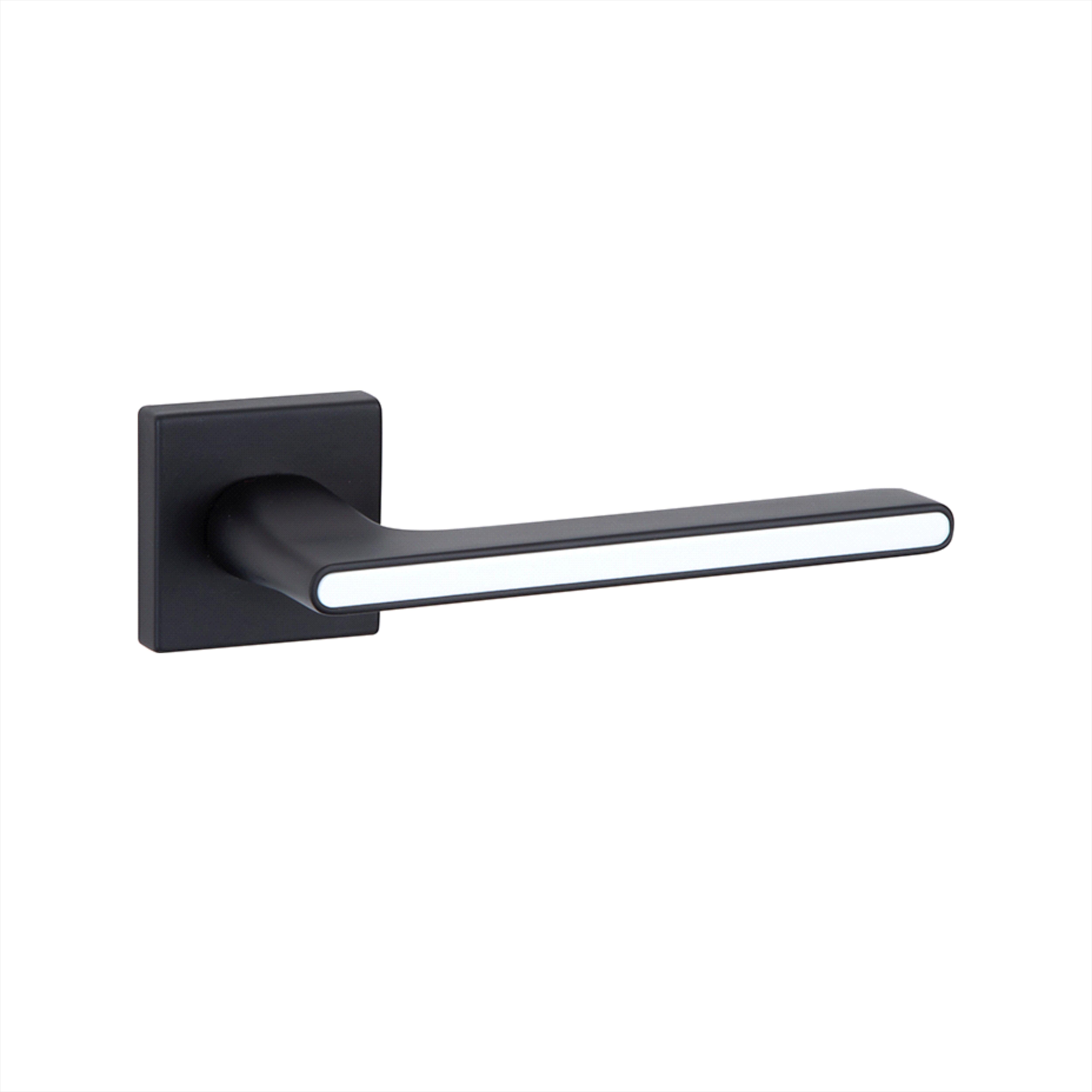 Juego de manillas con roseta para puerta, realizada en zamak, en color negro y detalle en blanco