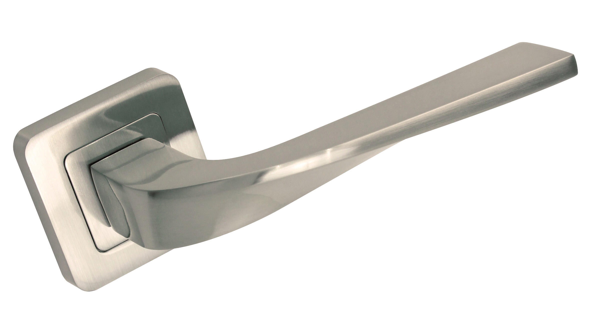 Juego de manillas con roseta para puerta, realizada en Zamak con acabado en níquel satinado. Diámetro de 52 mm.