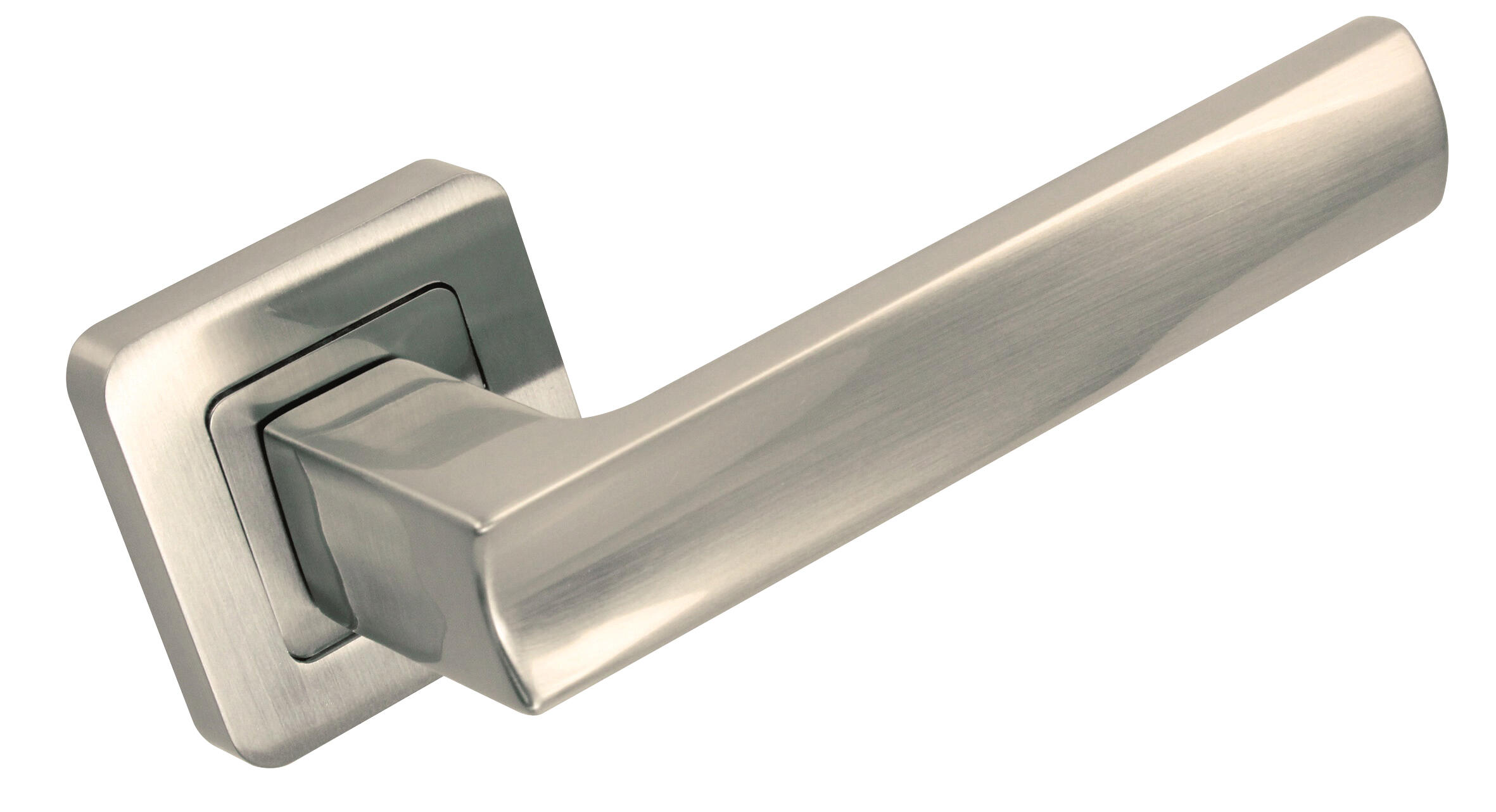 Juego de manillas con roseta para puerta, realizada en Zamak con acabado en níquel satinado. Diámetro de 52 mm.