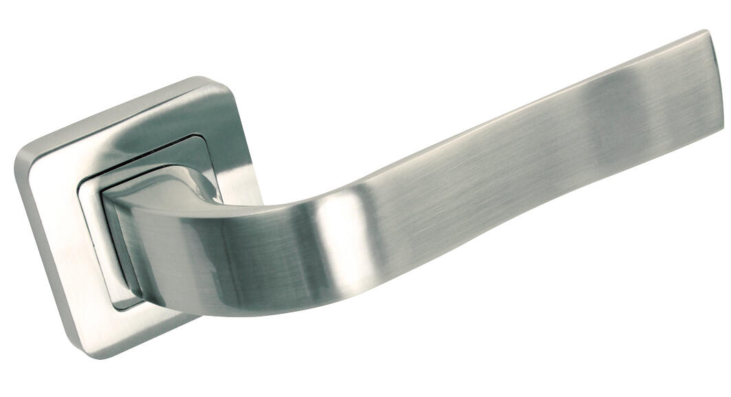 Juego de manillas con roseta para puerta realizada en Zamak con acabado en níquel satinado. Diámetro de 52 mm.