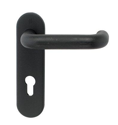 Manilla para puertas antifuego La placa interior está fijada a la manilla recubierta en polipropileno negro. Las fundas del mismo material se fijan al escudo interior mediante clips. Placa con perforación a 72 mm. La manilla de alma de acero esté recubierta de polipropileno negro, que confiere rigidez y dureza, alta resistencia frente a disolventes, ausencia de carga electrostática, estabilidad respecto a la luz y a diferencias de temperatura.