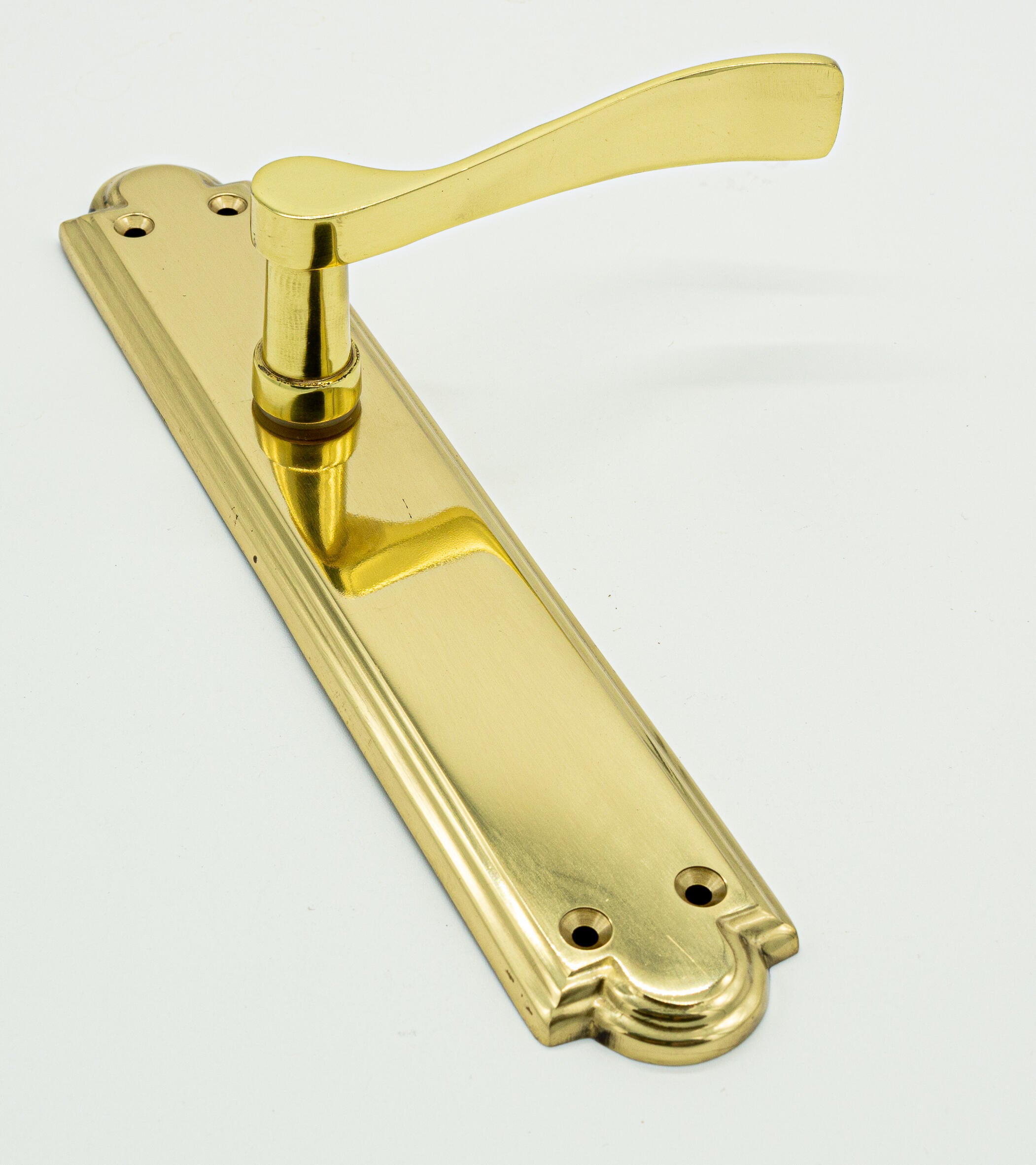 Juego de manilla o manivelas para puerta interior con placa lisa, realizada en latón y con un acabado en latón pulido brillo.