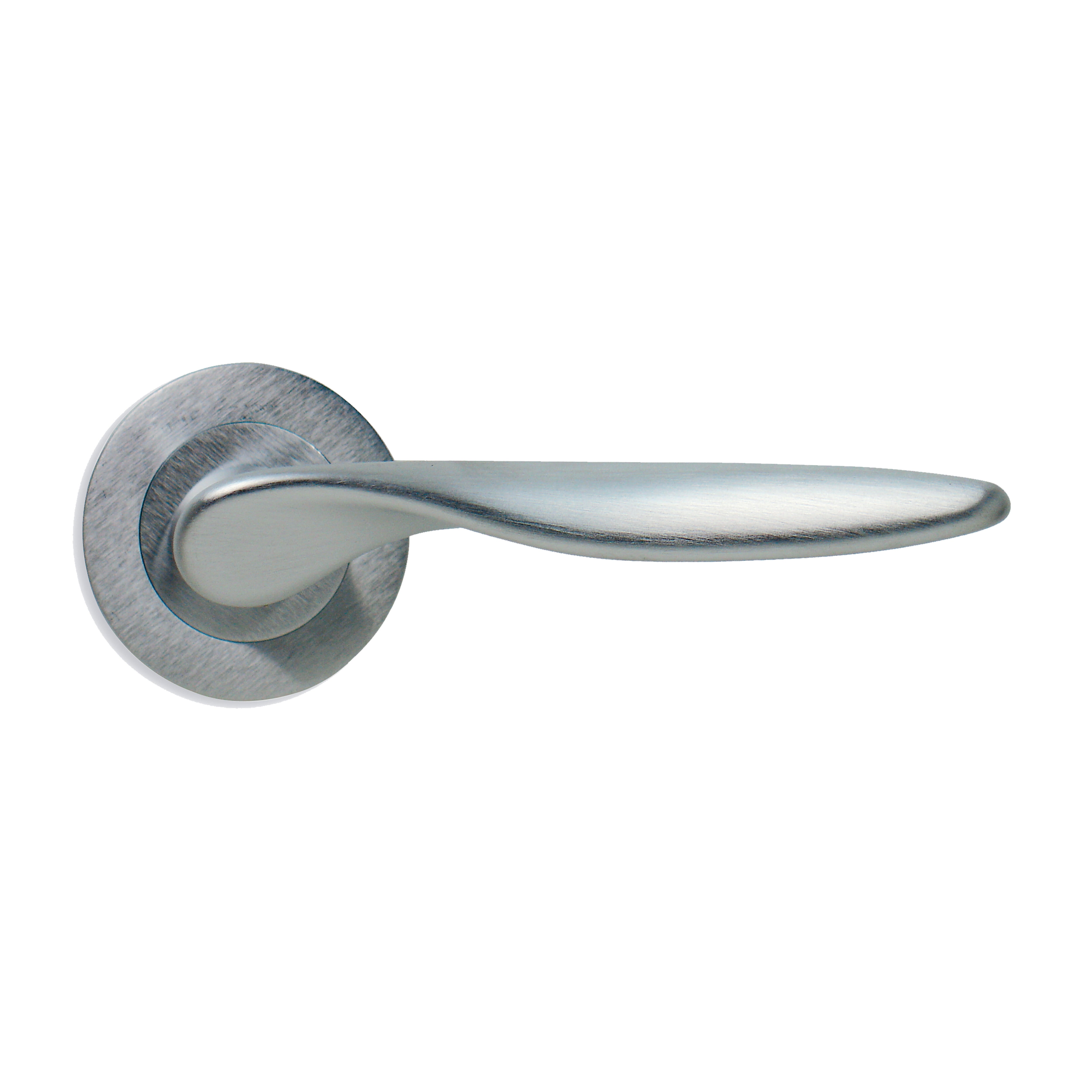 Juego de manilla con roseta para puerta, realizada en latón con acabado cromo satinado de 52 mm de diámetro