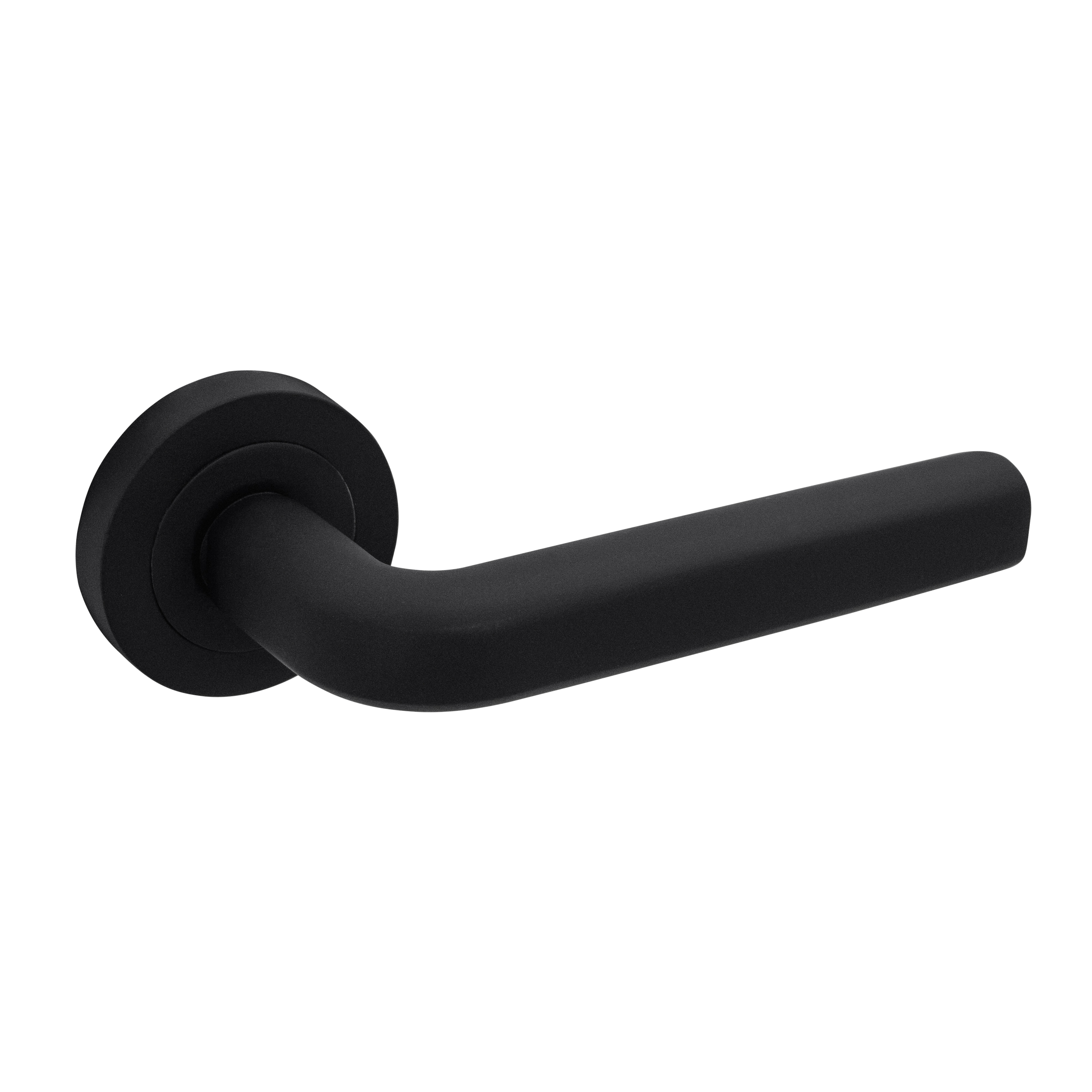 | Juego de manivela con roseta redonda de 50 mm de diámetro realizada en Aluminio y acabado negro. Modelo DOHA |