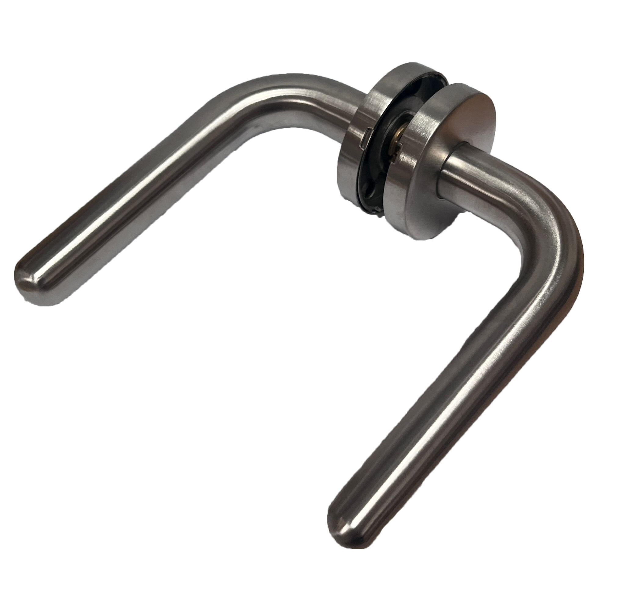 Juego de manilla de roseta redonda realizada en acero inoxidable AISI 304. Muelle de recuperación protegido por un cartucho de aluminio. Roseta interior fabricada en acero al carbono. Roseta exterior fabricada en acero inoxidable AISI 304. Mango circular en forma de «L» con terminación redondeada.Acabado en acero inoxidable.