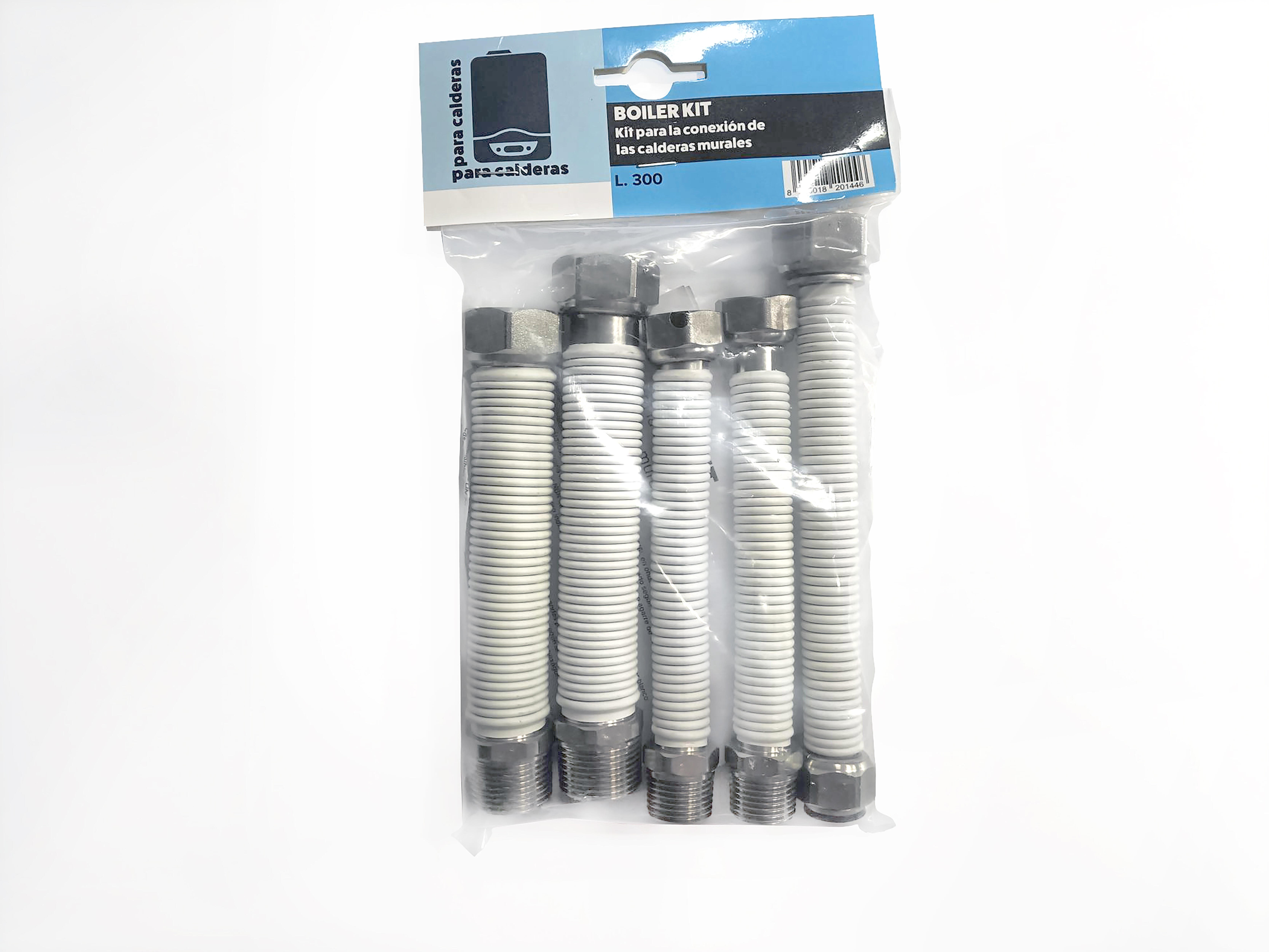 Kit para conexiones de caldera de pared compuesto por: - 1 extensible DN-20 (3/4”) longitud 180 x 300 M-F F-G (sólo para gas). De acuerdo con la normativa de instalación de tuberías de gas estándar. UNE11353:2010 - 2 extensibles DN-20 (3/4”) de longitud 150 x 300 M-F F-G (sólo para agua). - 2 extensibles DN-12 (1/2”) de longitud 150 x 300 M-F F-G (sólo para agua). - 1 junta de goma NBR EN 549