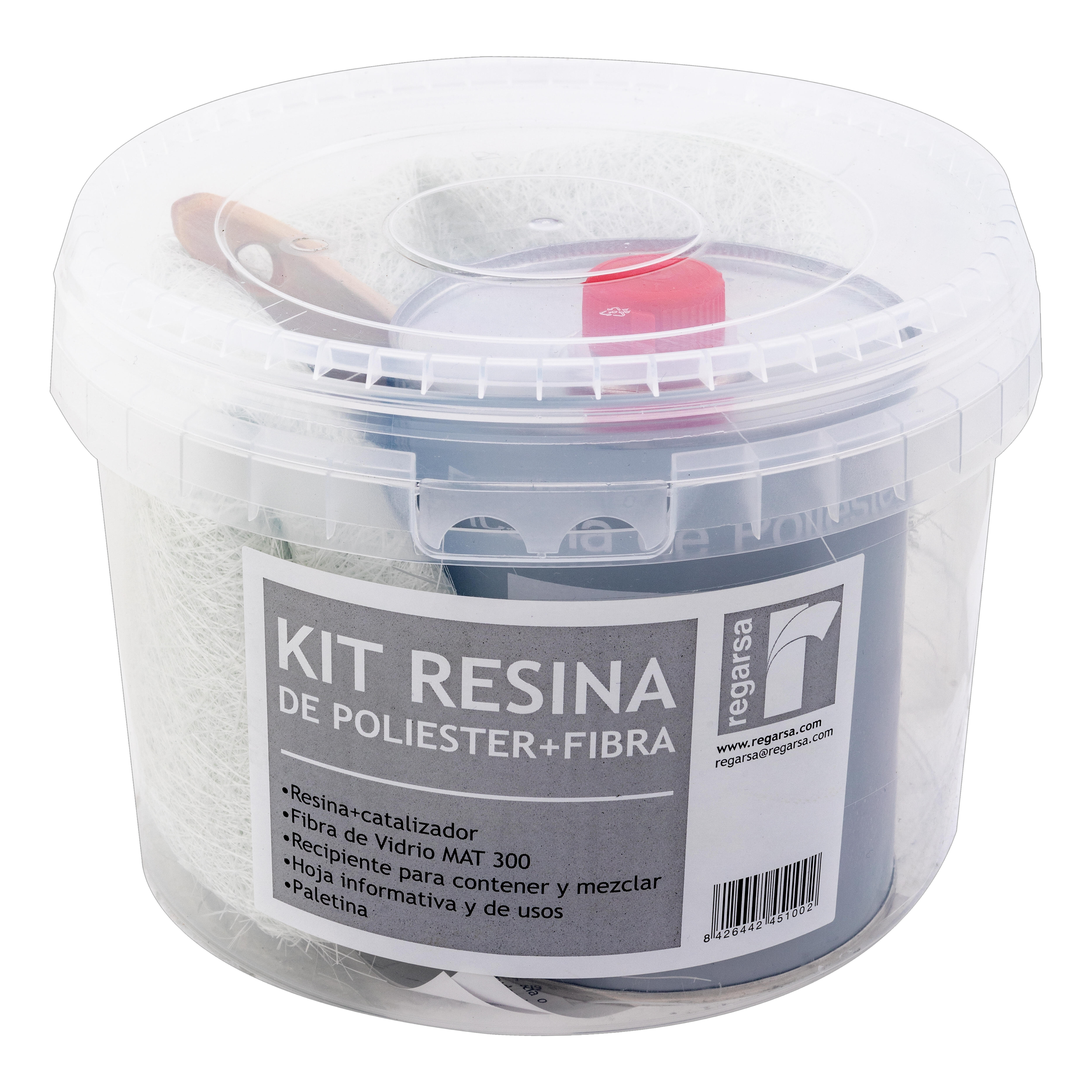 Para reparación de carrocerías, embarcaciones, tuberías, depósitos de agua, piscinas, techos, etc. Contiene 0,7 Kilo de resina de poliéster, 1 m2 de MAT de fibra de vidrio de 300gr/m2 y peróxido de Mek