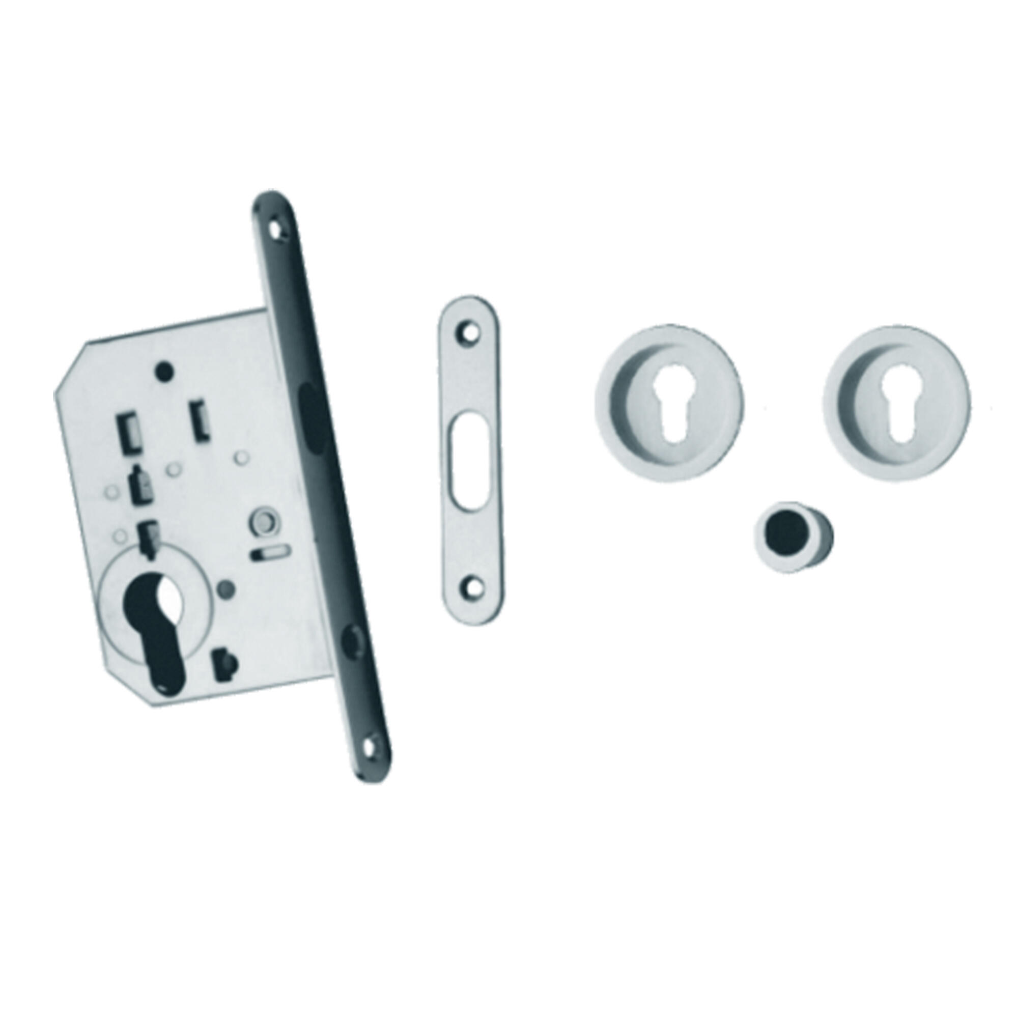 Conjunto cierre para puerta corredera de 35 mm con bocallave. Incluye cerradura, cerradero, boacallave, dedal y tornillos. Se puede poner cualquier cilindro de leva larga. Acabado niquelado