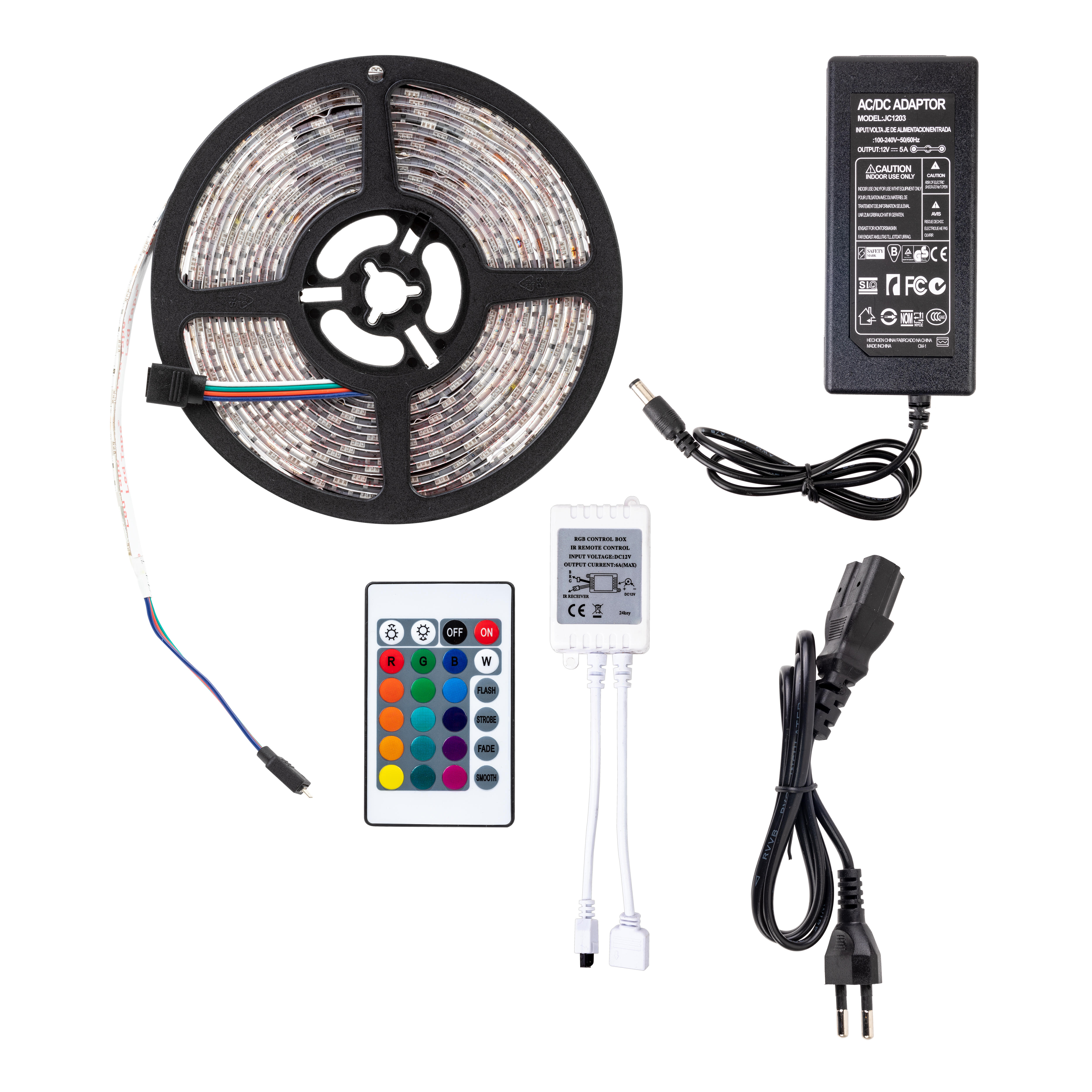 Ver productos de la misma categoríaKit tira led de 230V. Rollo de 5 metros, potencia 9,6W/m. Luz RGB. Grado de protección IP44. Flujo luminoso 400lm/m. Incluye fuente de alimentación y mando a distancia para su regulación.