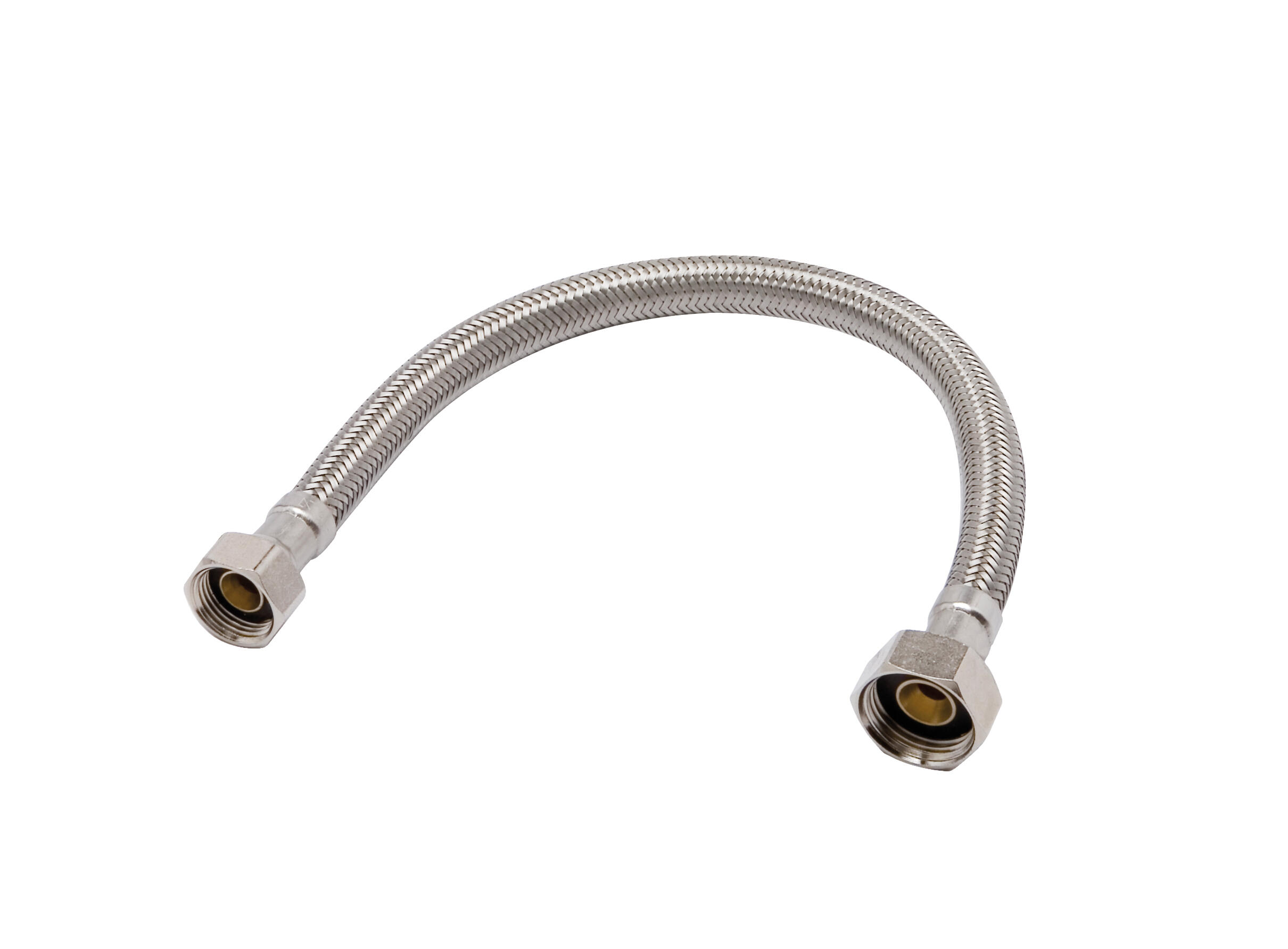 Tubo flexible tradicional con tubo interno en EPDM para conectar la red de abastecimiento de agua con los grifos individuales y los mezcladores instalados en lavabos, bidés, fregaderos de cocina, cisternas de inodoros. Capaz de garantizar un caudal de agua de 32 litros/min. a una presión de 3 bar; Equipado con acoplamientos de latón, conectores y trenza de acero Inox. CARACTERISTICAS Conexión flexible de Ø 8 mm diámetro interior. Con una longitud de 30cm. Conexión Hembra de 3/8"-1/2". Temperatura de funcionamiento Desde -5ºC hasta 70ºC.