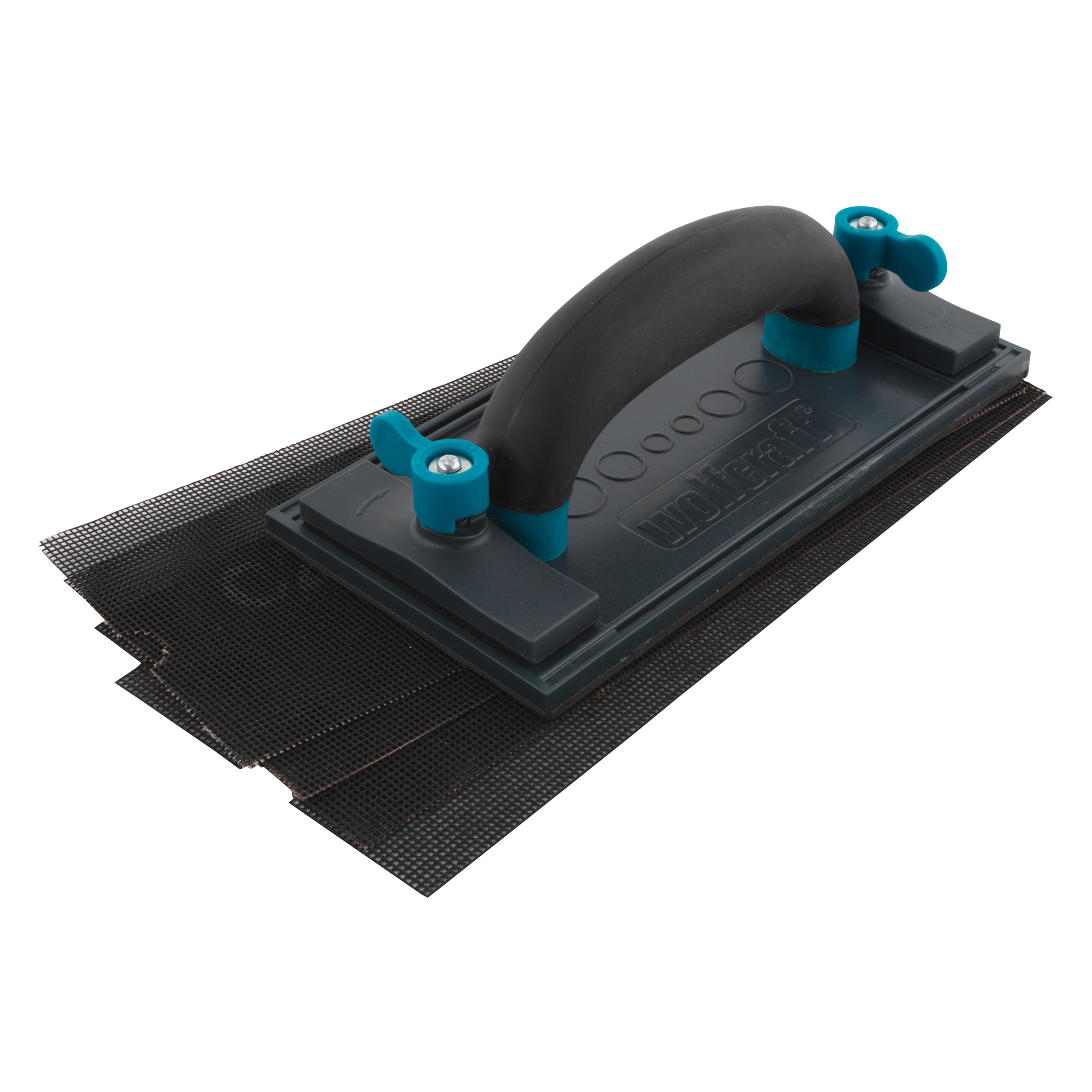 Juego de lijadora manual de 5 piezas. Mango ergonómico para un trabajo sin esfuerzo. Práctico mecanismo de sujección para una fijación segura del abrasivo. Incluye dos tejidos de rejilla con grano 120 y 220, para lijado grueso y fino.