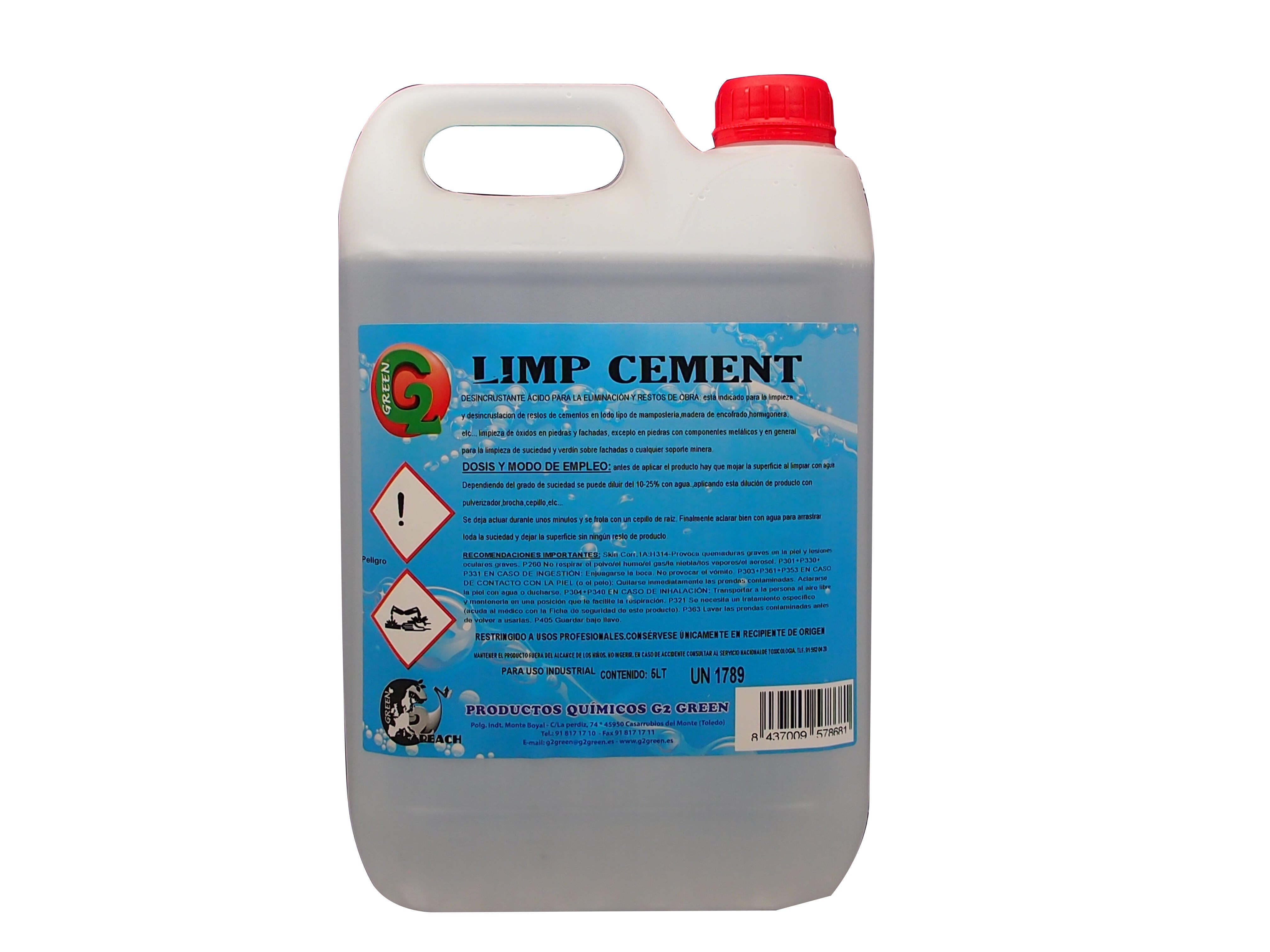 Limpia cemento 5l. Desincrustante específico para limpiar restos de cemento, óxidos, verdín, etc. Incorpora inhibidores de corrosión para una mejor pasivación de las superficies a tratar.