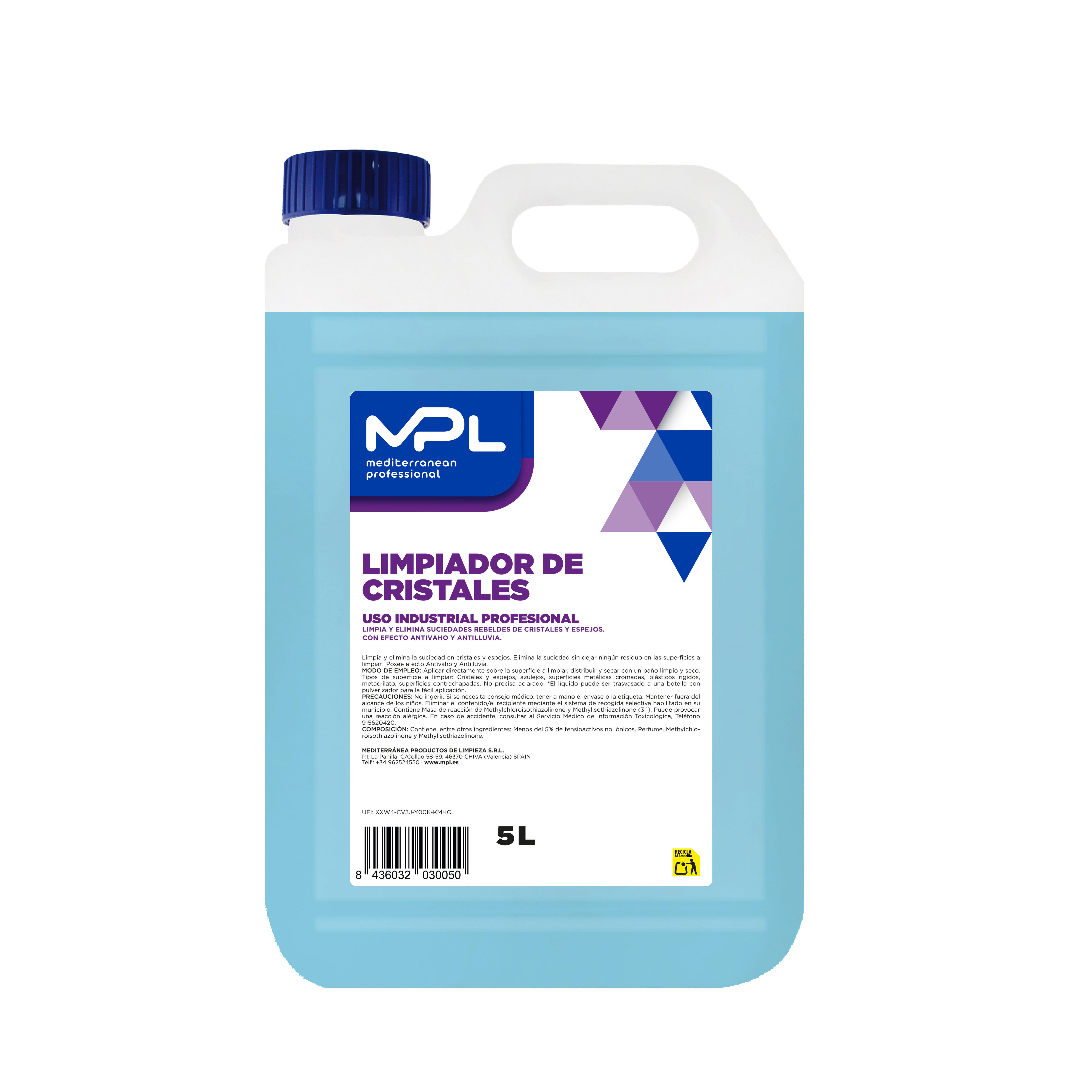 Limpiacristales 5l. Limpia y elimina la suciedad de cristales y espejos. Elimina la suciedad sin dejar ningún residuo en las superficies a limpiar.