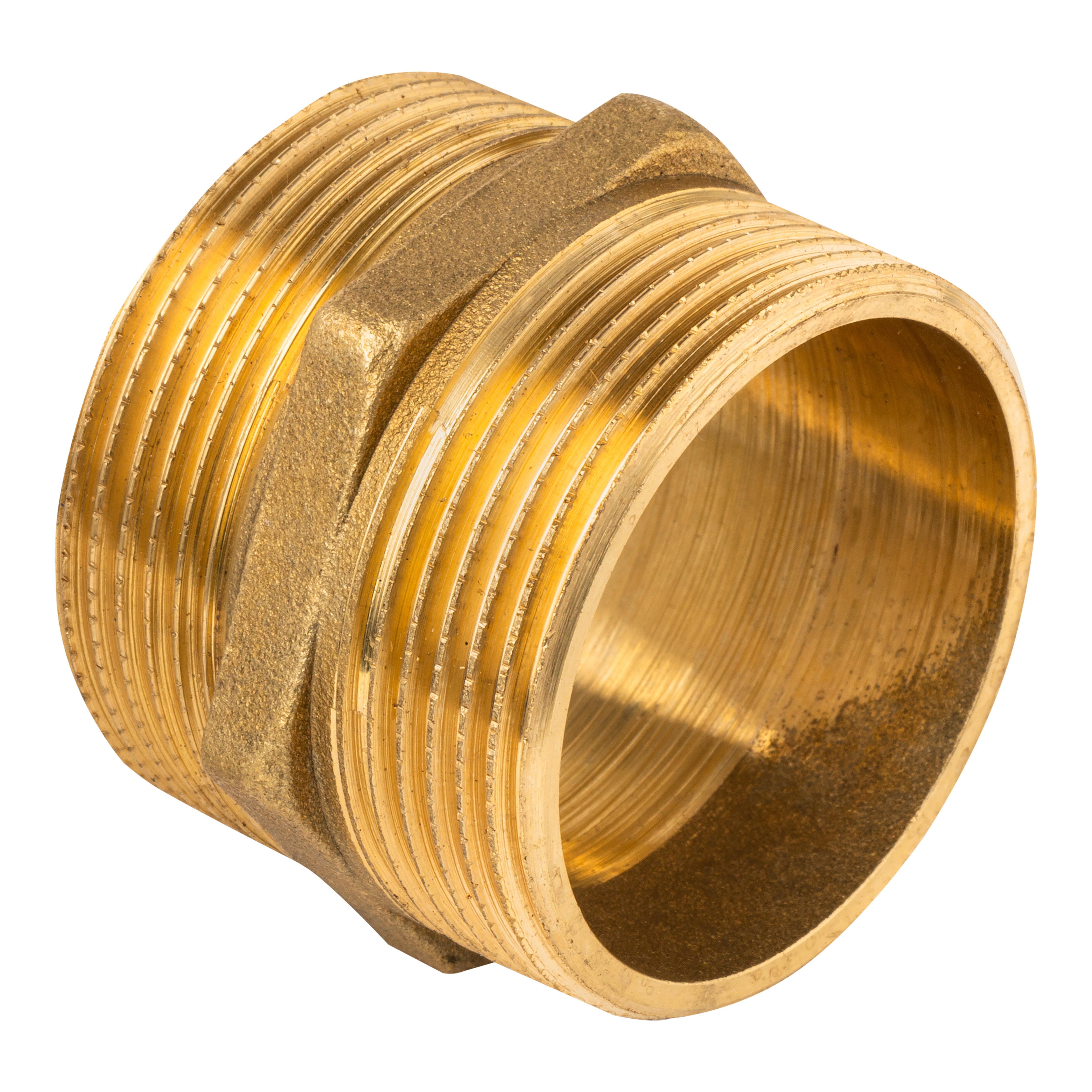 Machón de latón de gran calidad. De 1 1/2" de rosca a ambos lados. Cumple con la normativa y requisitos de la ISO para roscas de cierre. Accesorio de latón roscado para conexiones de tuberías de cobre.