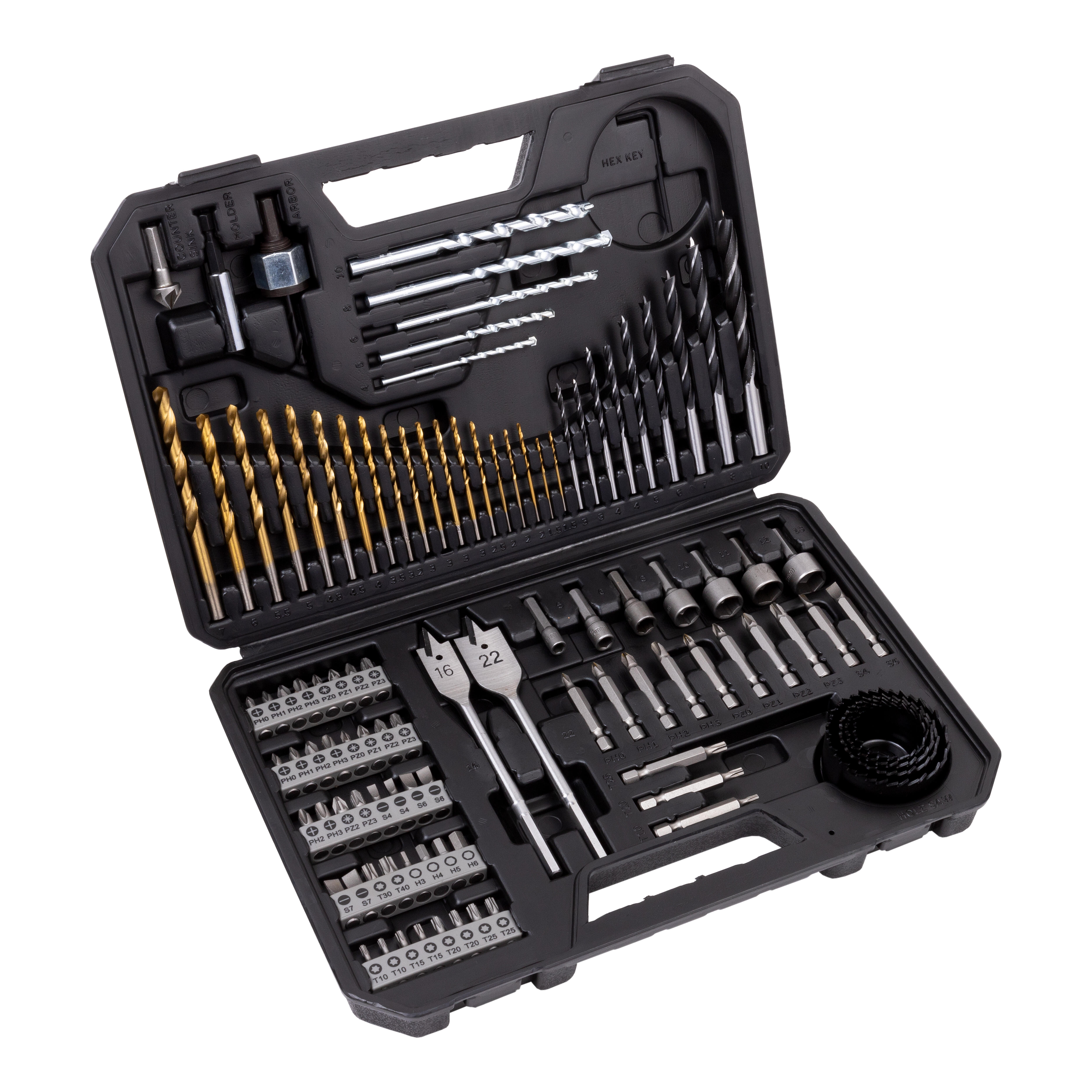 Maletín 103 piezas aptas para madera, mampostería y metal. Incluye: 19 brocas de metal de titanio-HSS, 5 brocas de mampostería, 9 brocas de madera, 2 brocas de pala de madera planas, puntas de destornillador (40 mm x 25 mm y 13 mm x 50 mm), 7 aprieta-tuercas, llave Allen, portabrocas magnético, avellanador, 4 sierras de corona y adaptador de sierras de corona.