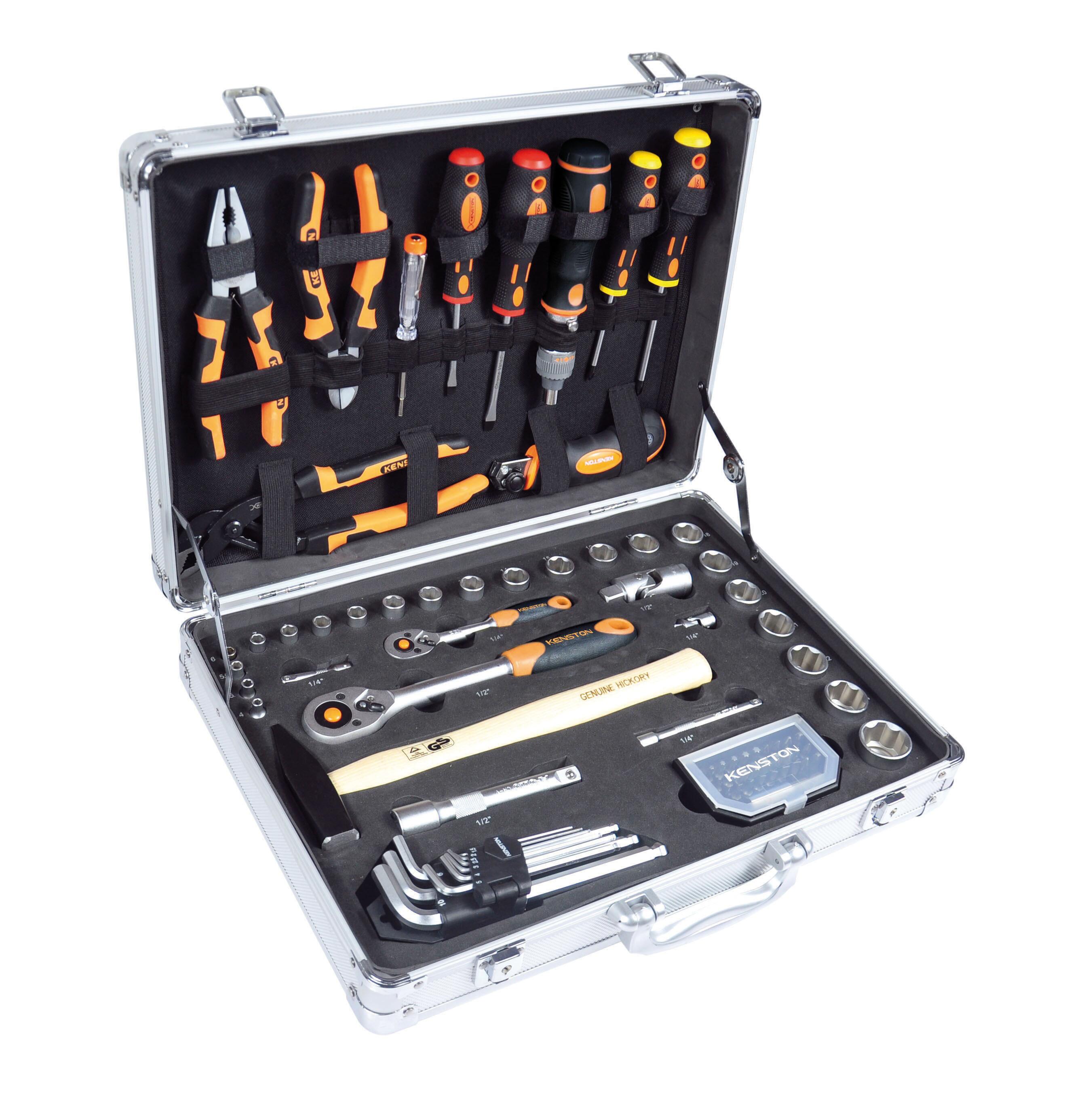 81 Piezas herramientas: 1 alicate 180mm, 1 cortador lateral 160mm, 1 alicate para bombas de agua 250mm, 1 Probador de voltaje 100-250 V, 2 destornilladores SL5.0x75mm, SL6.0x100mm, 2 destornilladores PH1x75mm, PH2x100mm, 9 piezas Llave hexagonal 1.5- 2-2.5-3-4-5-6-8-10mm, 1 Cutter con cuchillas de 18 mm, 11 piezas 1 / 2''DR. 1 pieza 1/2 '' Mango de trinquete 72 dientes, 1 pieza 1/2 '' Barra de extensión 125 mm, 1 pieza 1/2 '' Junta universal, 11 piezas 1/4 '', 2pcs-1 / 4''Barra de extensión 50mm y 100mm, 1pc 1/4'',1 martillo 25 mm, 1 soporte magnético.