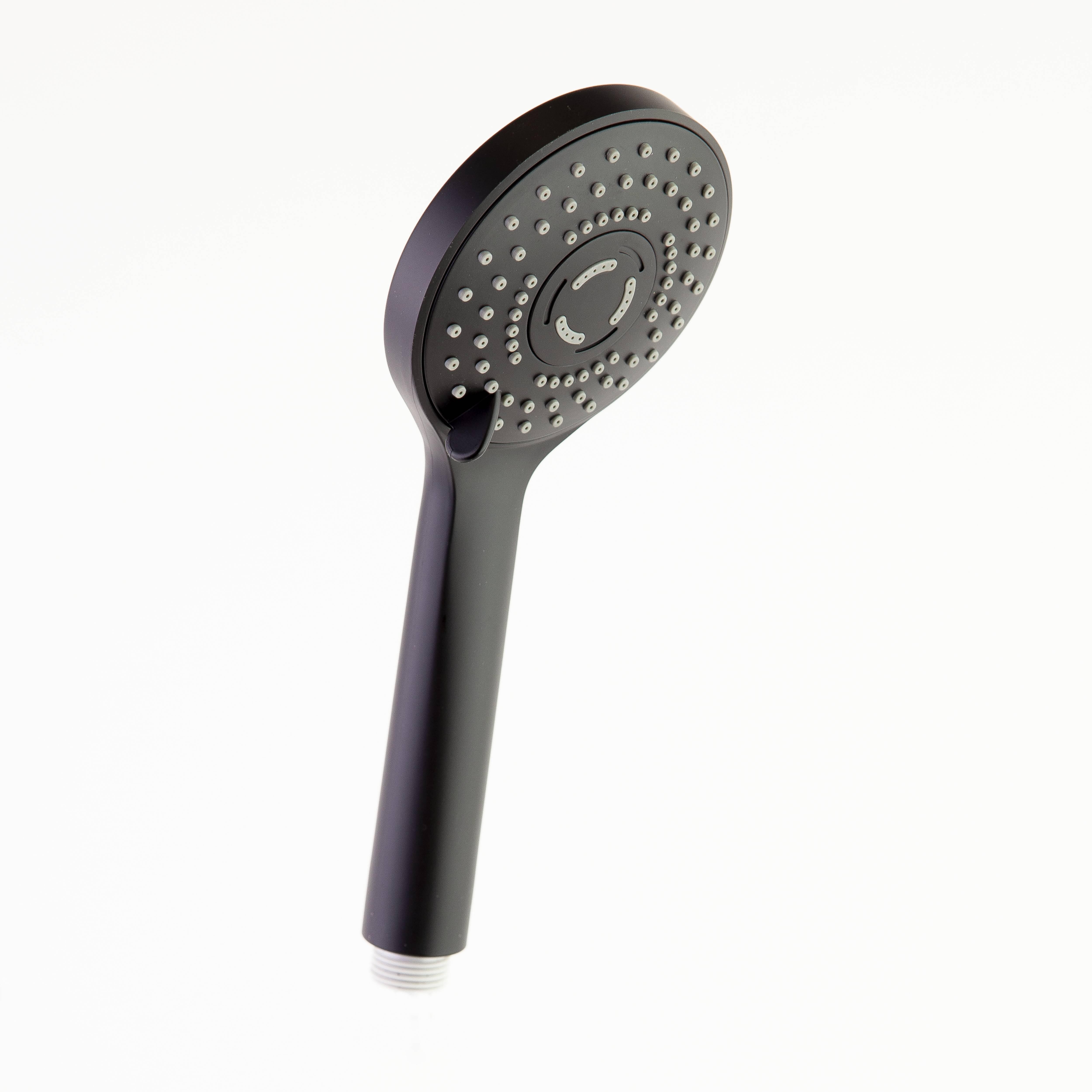 Mango de ducha redondo RS, de la marca Ramón Soler, fabricado en ABS acabado negro mate, con 3 funciones.