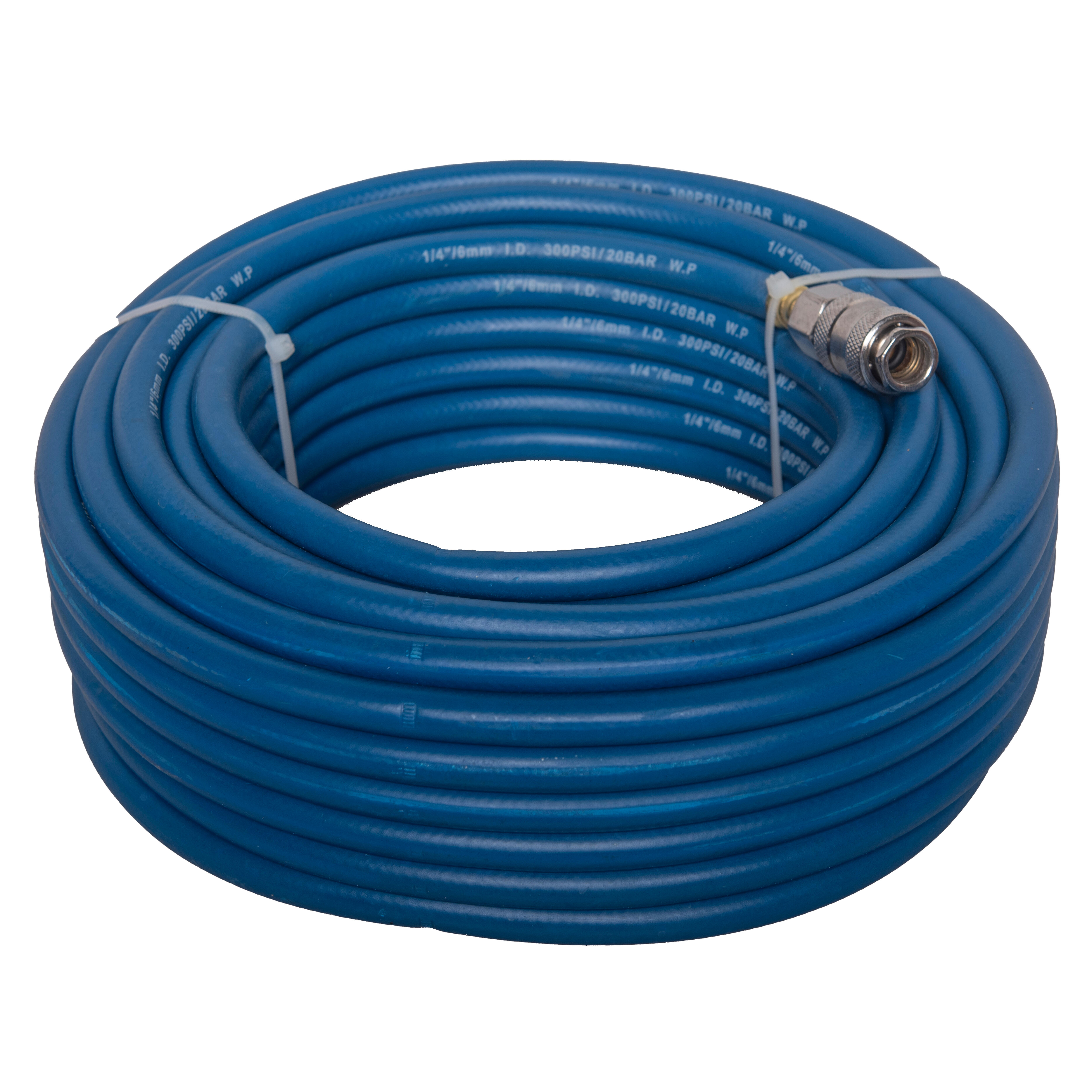 Rollo de manguera de goma para aire, diámetro 6x12mm, longitud 20 metros y terminales enchufe rápido y acople universal.