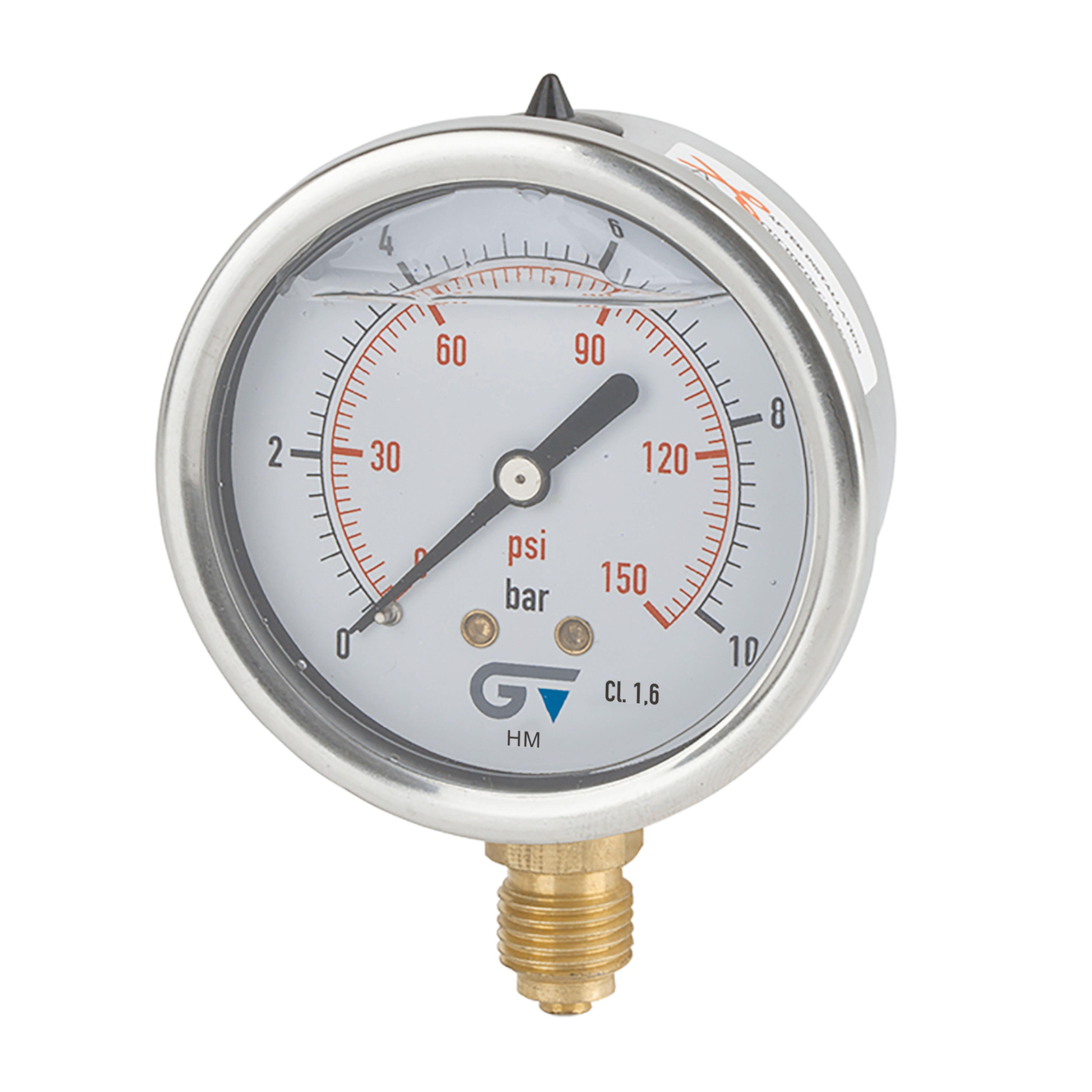 •Manómetro con conexión entre 0 y 6 bar. •Rosca de conexión Macho de latón a 1/4". •Relleno de glicerina. •Para instalar en reductores de presión.