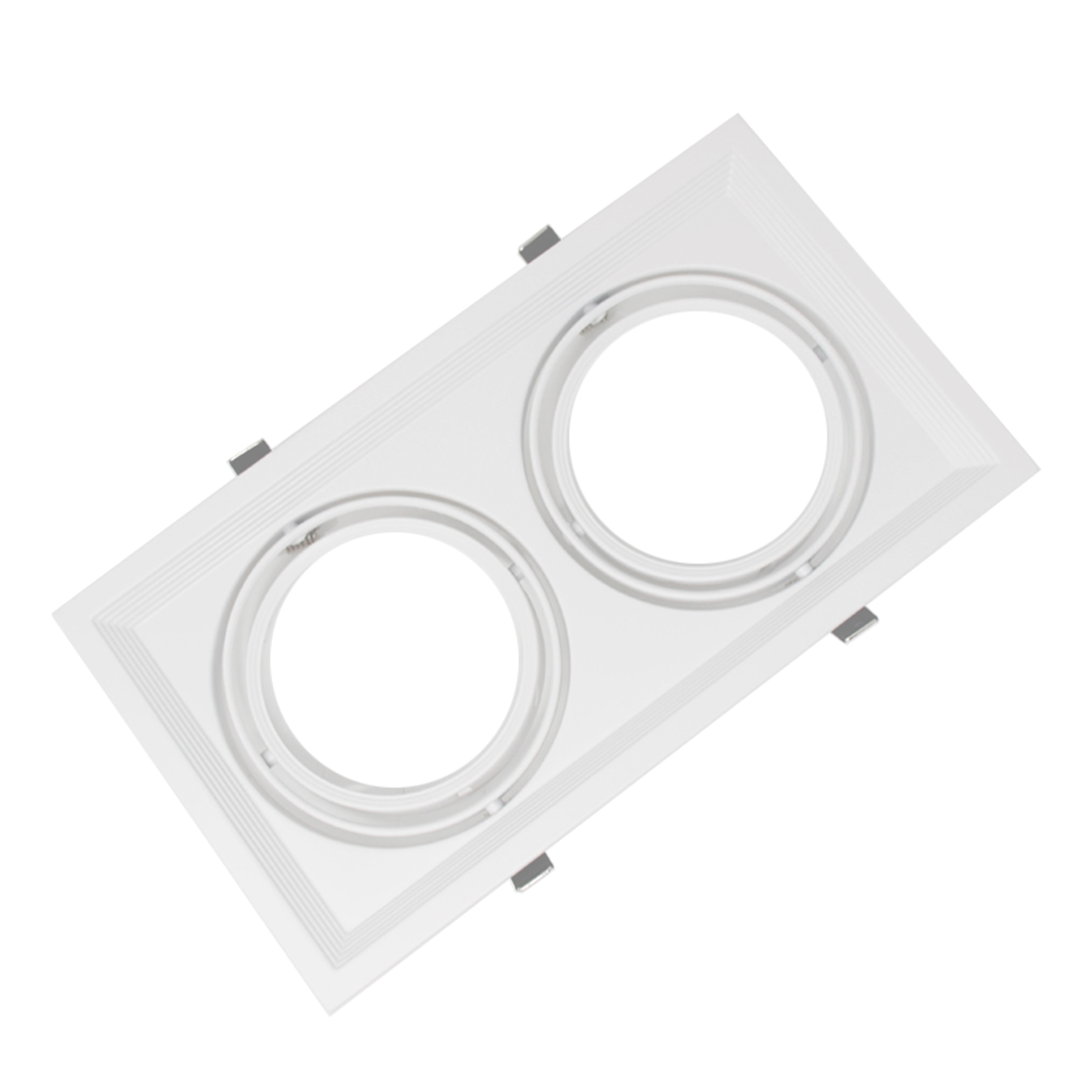 Marco de AR111 2 agujeros blanco. Accesorio para fuente de led AR111, orientable. Permite instalar 2 fuentes led. Fabricado en aluminio, acabado en blanco con una protección IP20.