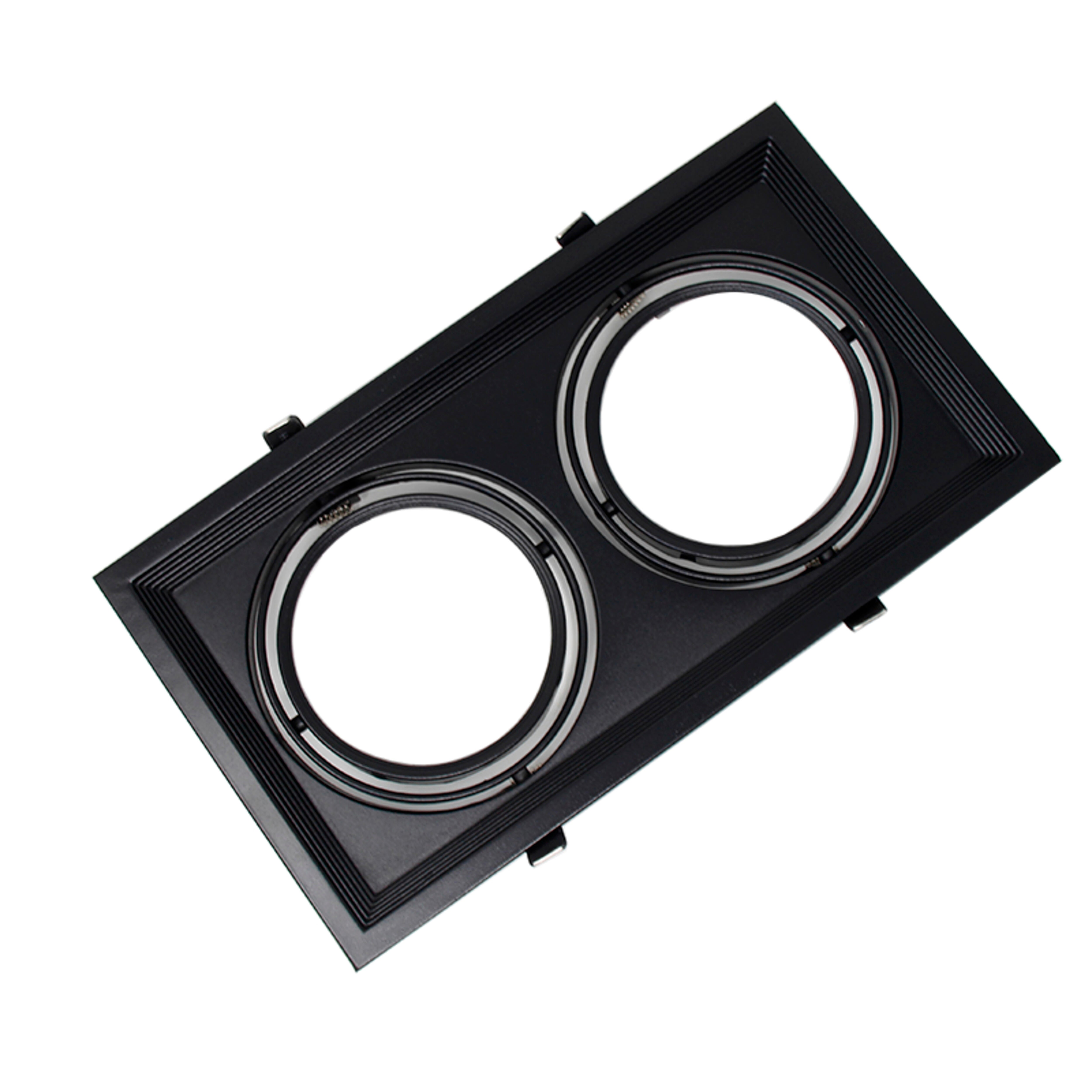 Marco de AR111 2 agujeros negro. Accesorio para fuente de led AR111, orientable. Permite instalar 2 fuentes led. Fabricado en aluminio, acabado en negro con una protección IP20.