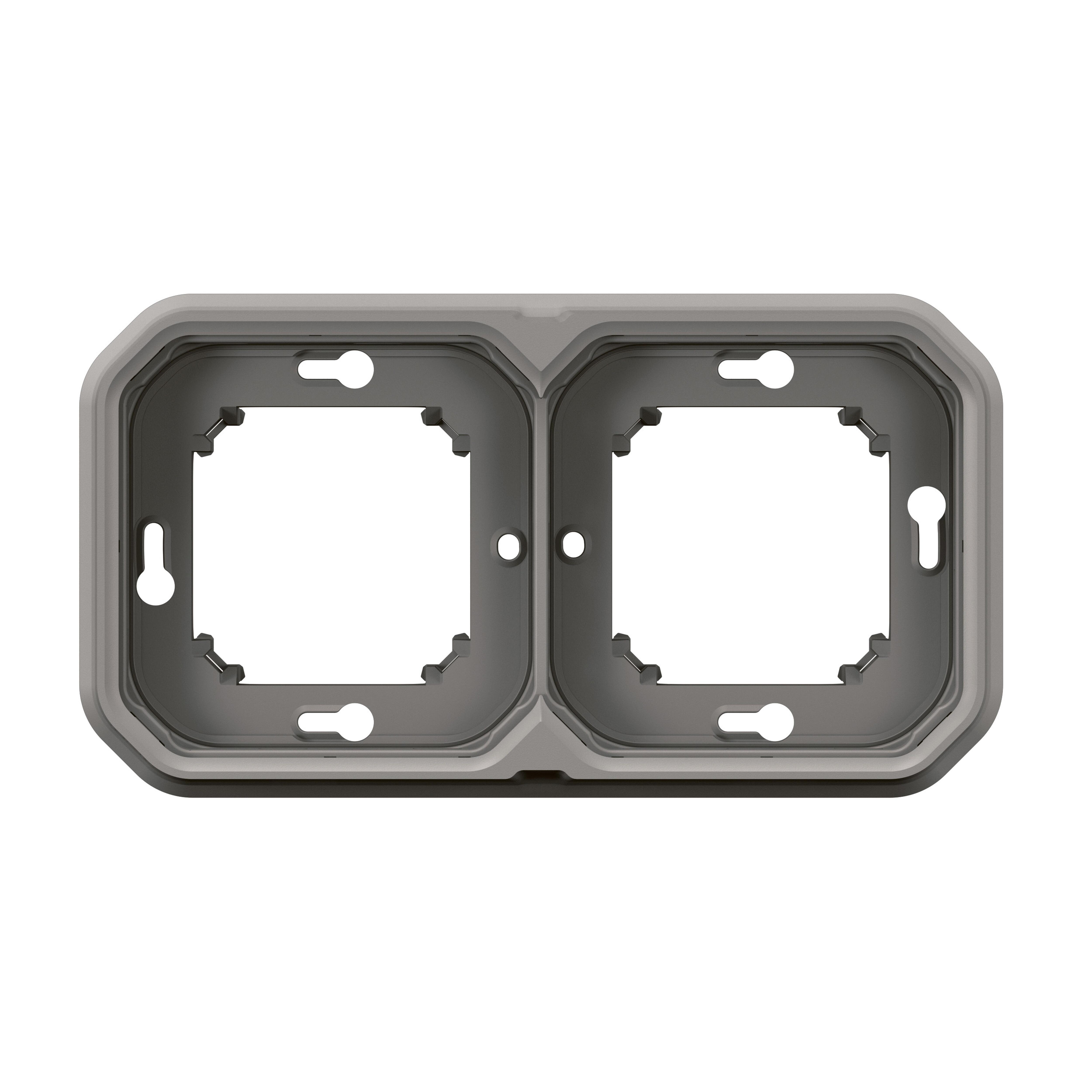 Marco doble de empotrar componible color gris 10Ax - 250va. Mecanismos con IP55, protección frente a líquidos. IK07