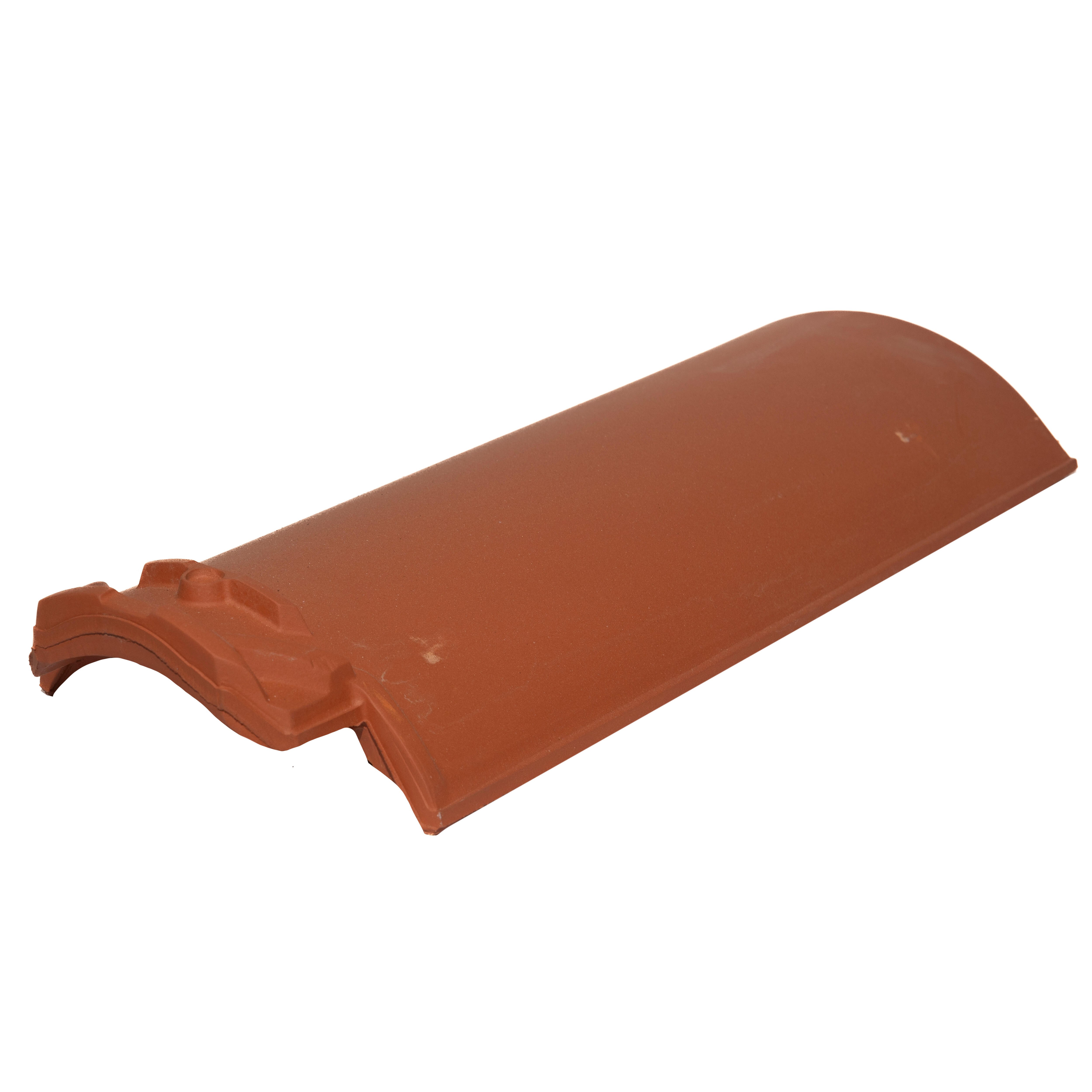 Media teja cerámica klinker hydra de color rojo. Pieza con la misma longitud y curvatura de la teja, que a la que se le ha eliminado la parte plana. Es complementaria con los remates laterales, para los extremos del faldón, o para ajustar la anchura en los encuentros con chimeneas, etc. Remata y cubre la mitad plana de la teja en el extremo del faldón. Mantiene la estética del tejado a lo largo del paño completo. Medidas: 45,8x18cm.