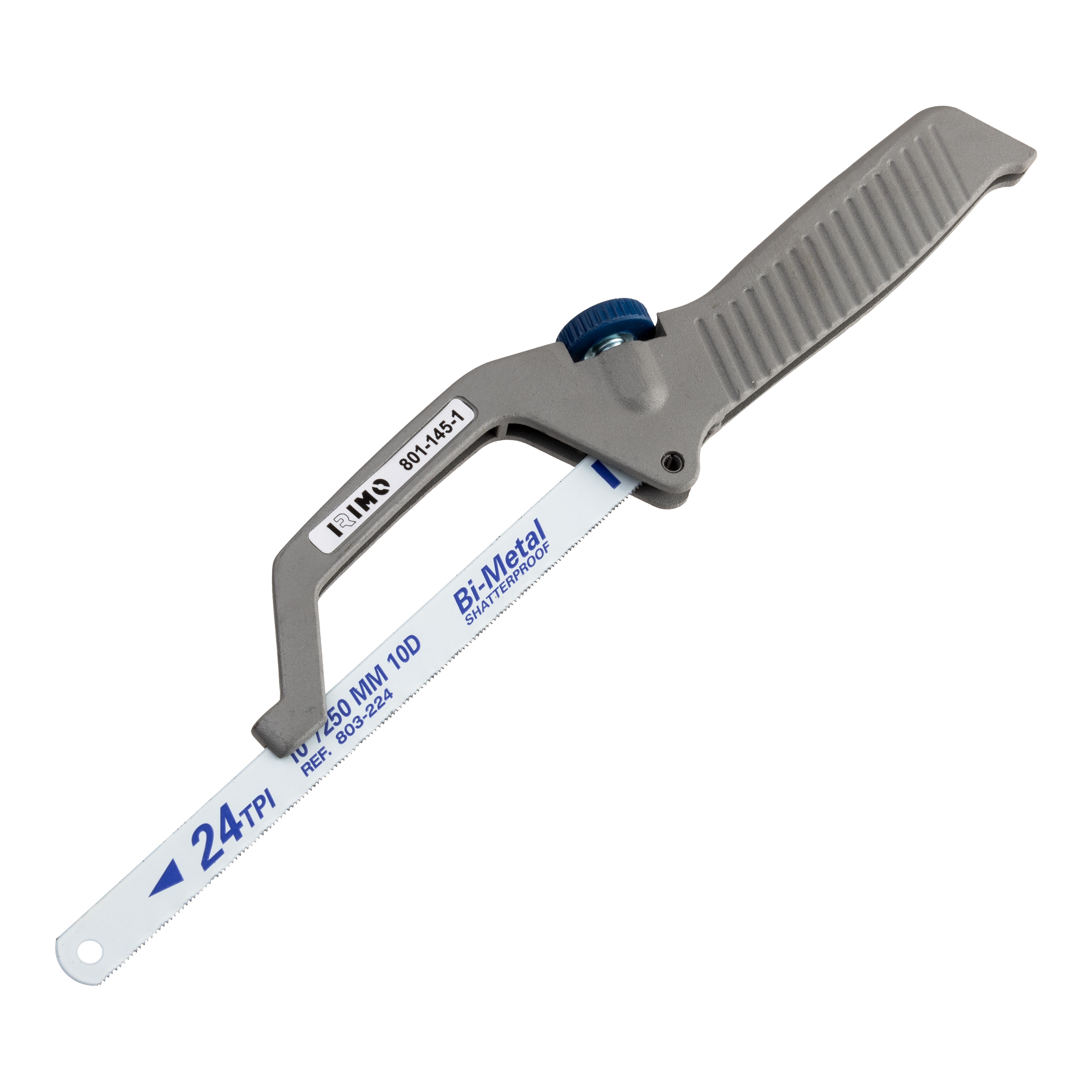 Mini arco sierra metal 330mm con mango bimateria. Muy útil para cortar en lugares difíciles. De muy fácil manejo. Se suministra con una hoja de sierra de 24 DPP. Peso: 149gr.
