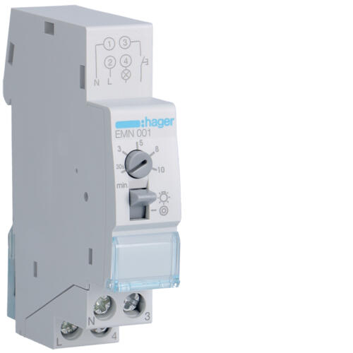 Minutero de escalera 16A, 230V.Permite economizar energía y asegurar el funcionamiento de la carga. Temporización regulable de 30 segundos a 10 min. Muy silencioso. Instalacion en carril DIN. Numero de modulos: 1. Marca Hager