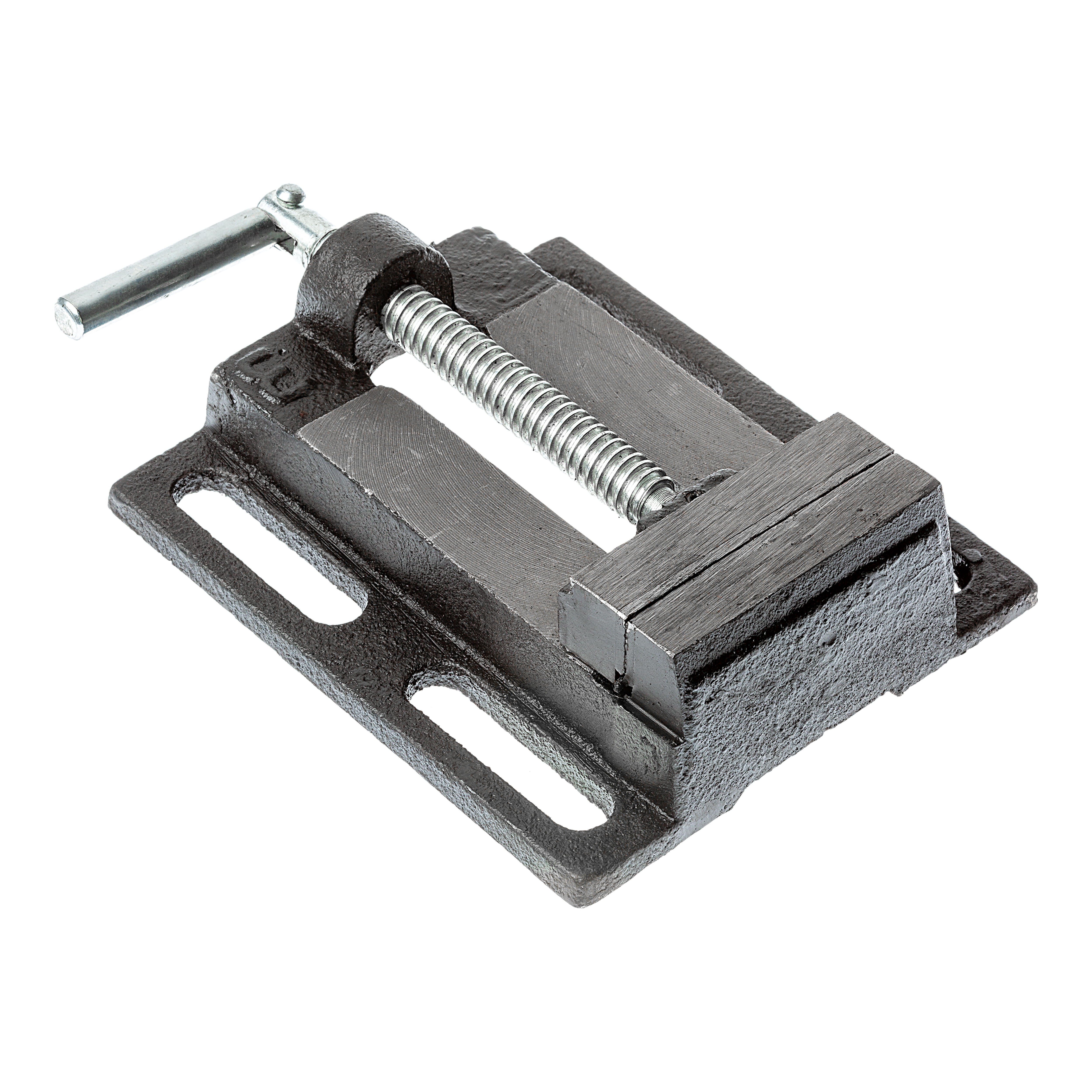 Mordaza para sujeción segura de piezas en taladros de columna y en general. 75mm. Solida construcción en fundición gris fresada y acero mecanizado. 4 ranuras de fijación para sujetar firmemente la mordaza a la mesa del taladro. Agarre fuerte y sin daño por garras con zapatas de 3mm en acero rectificado y moleteado. Husillo de acero roscado con cuatro puntos de apoyo y palanca de giro abatible. Diseño de meseta y canal en garra fija para optimizar la salida de taladrina.