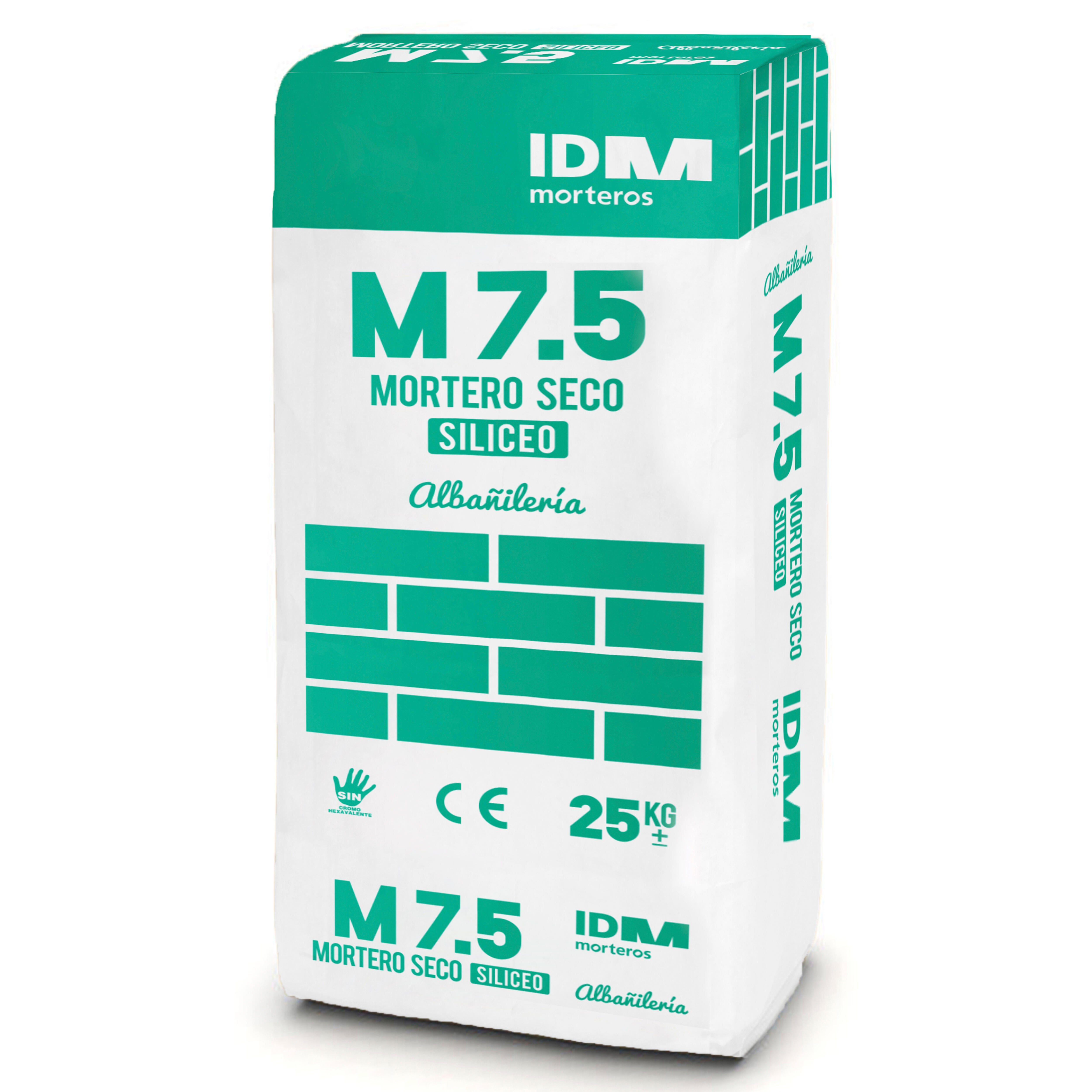 Mortero seco gris M7.5 silíceo con una optima trabajabilidad y adherencia. 7,5 N/mm2. Usos: enlucidos, levantar muros, paredes de carga, de mampostería tradicional, especial para un buen acabado en revestimientos.