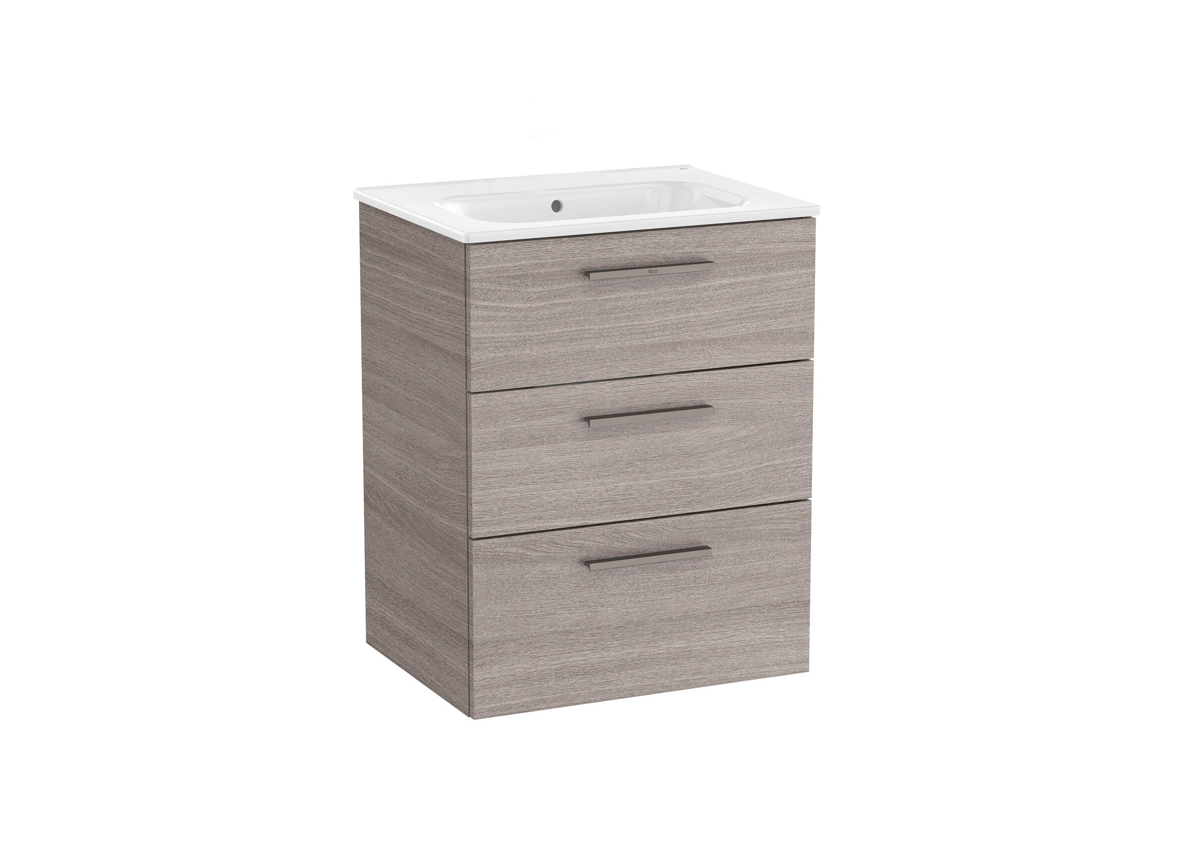 Mueble de baño suspendido con lavabo de la marca Roca, modelo Penteo. En color roble. Medidas 45,5x58,5x74,1cm. Distribución de tres cajones.