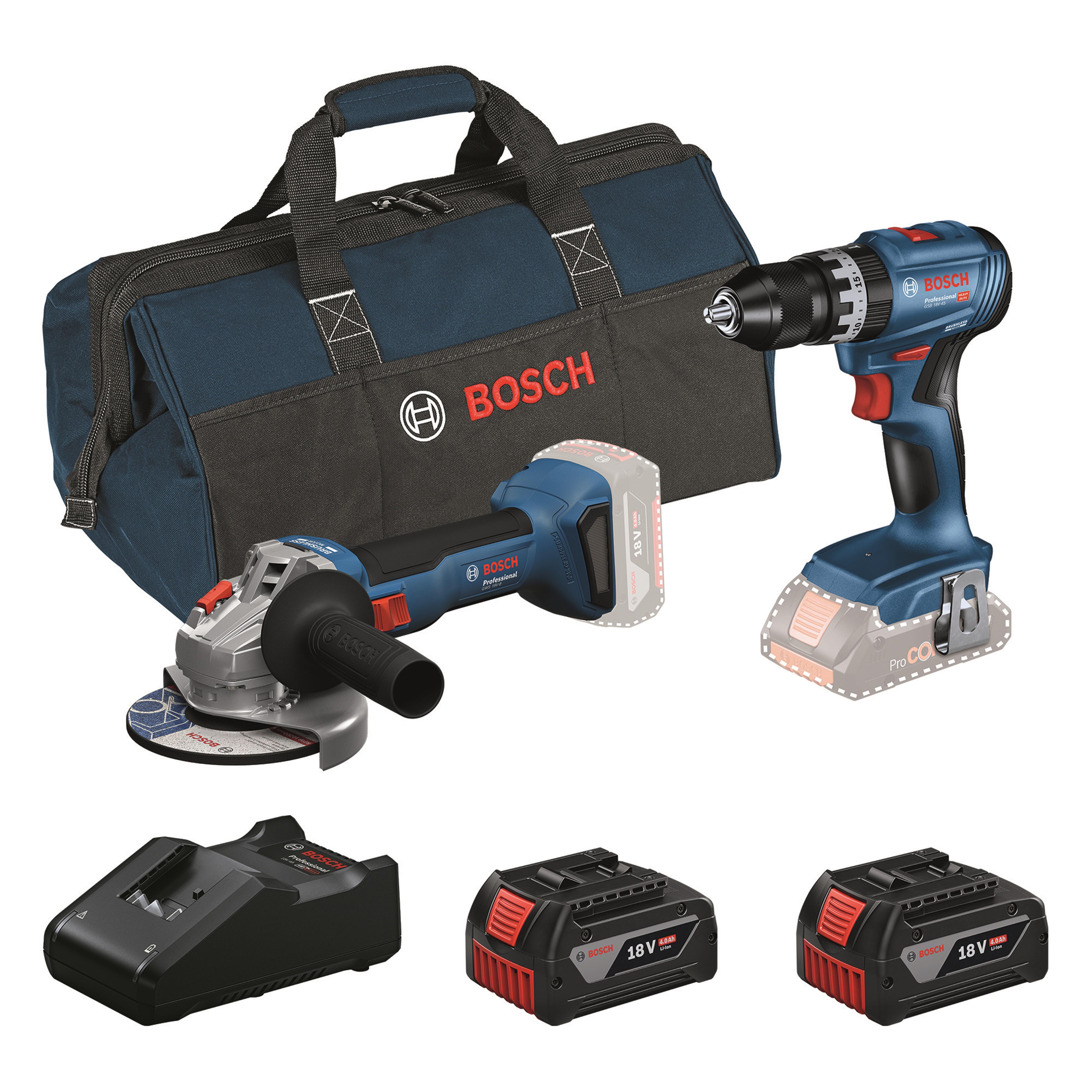 PACK 18V TALADRO PERCUTOR BRUSHLESS GSB 18V-45 + AMOLADORA 125MM BRUSHLESS GWS 18V-8 BOSCH