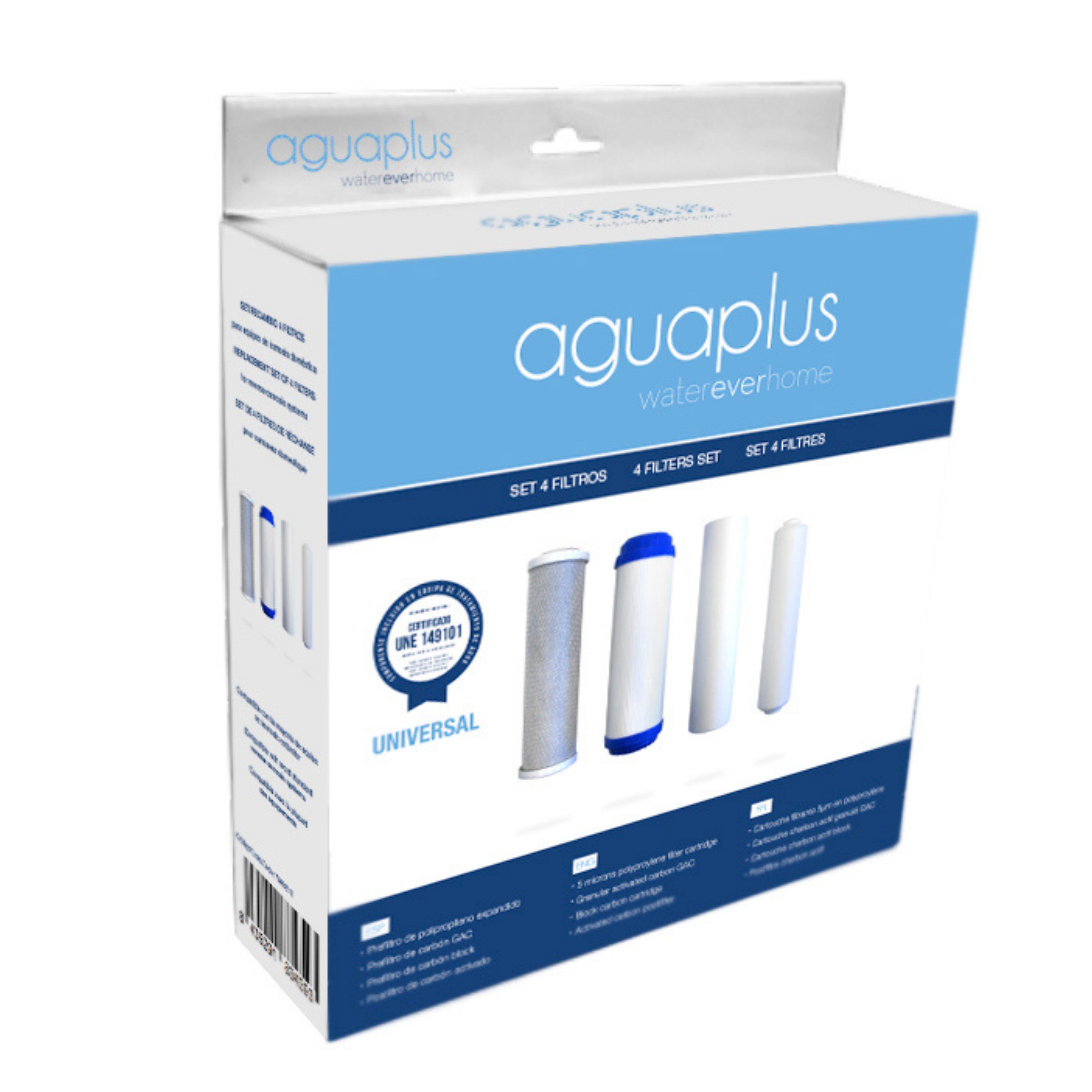 Filtro de sedimentos fibra 10”: retiene todas las partículas en suspensión que se puedan encontrar en el agua superiores a 5 micras Filtro de carbón granular 10”: elimina el cloro presente en el agua, así como componentes orgánicos, además de metales pesados, herbicidas o pesticidas Filtro de carbón activo 10”: elimina cualquier olor o sabor presente en el agua y mejora la calidad de la misma Posfiltro: mejora el sabor y regula el pH de la misma