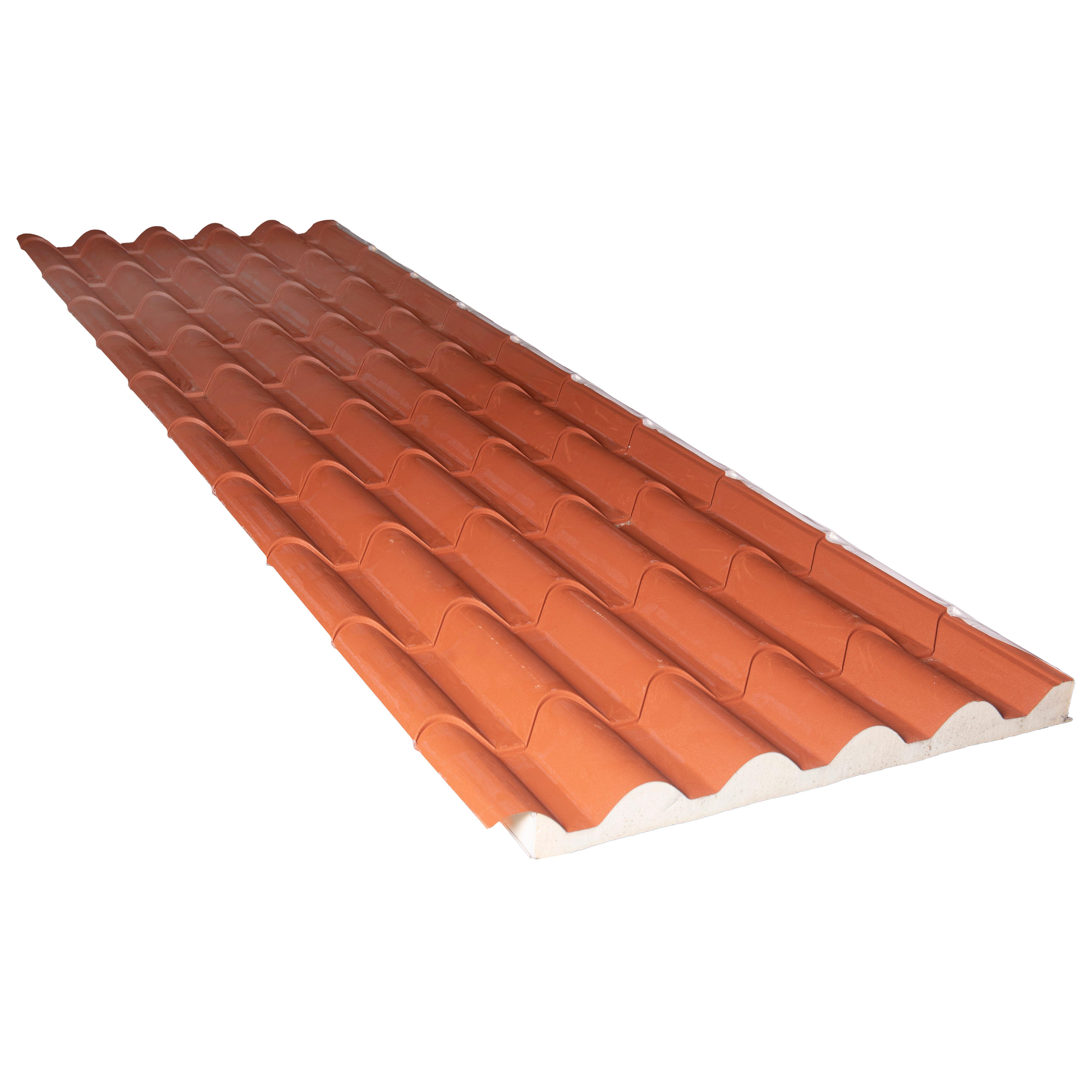 Panel sándwich imitación teja 3,5x1m y 40mm de espesor color rojo/blanco ideal para todo tipo de cubiertas, tanto en edificación industrial, como modular o comercial.