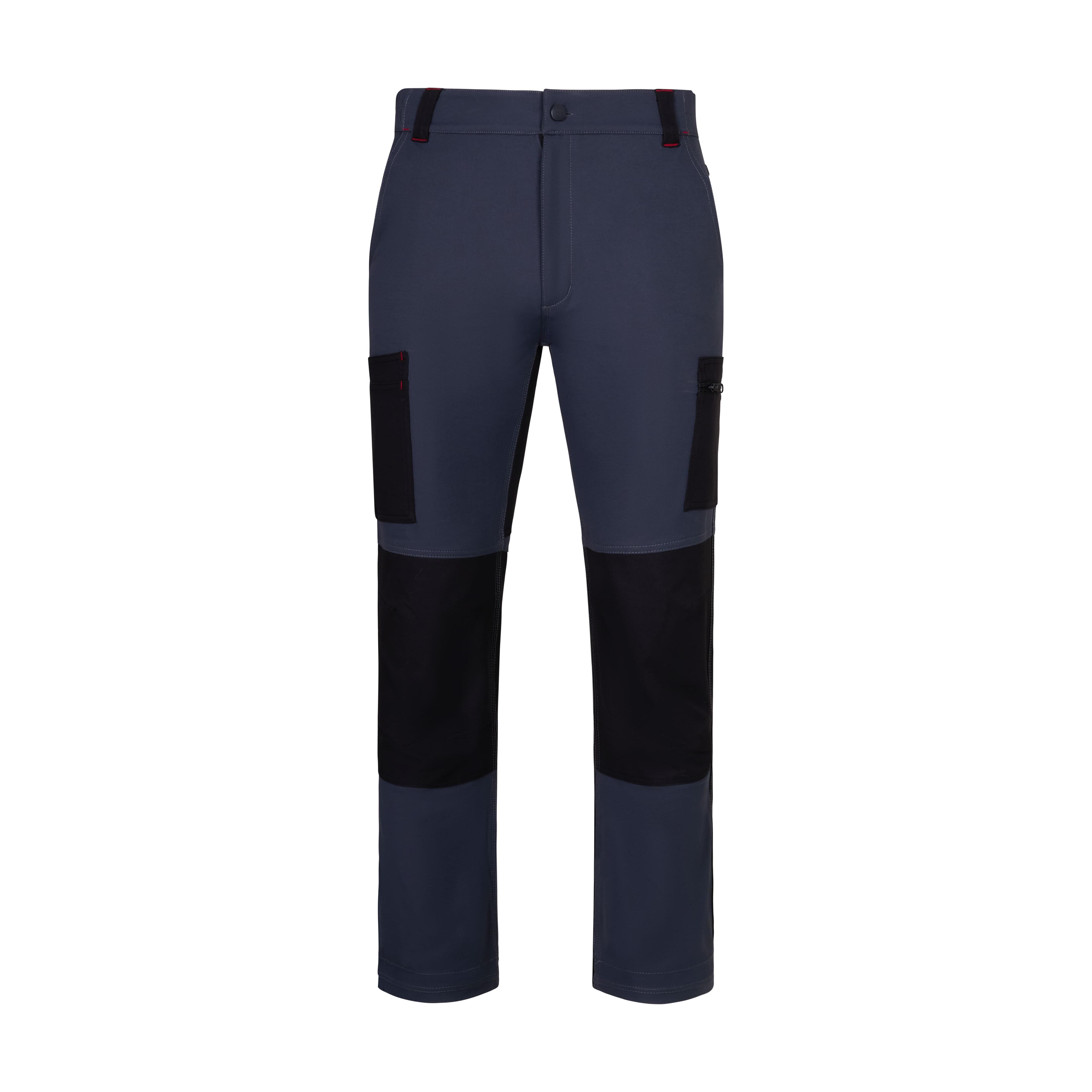 Color gris/negro. Sarga. 100% elastomultiéster. 280grs/m2. Corte slim fit. Triple costura de seguridad y costuras de refuerzo en rodilla. Cierre central con cremallera y botón personalizado. Cinturilla trasera elástica. Bajo extensible. 8 bolsillos. Modelo 4-Xtreme.