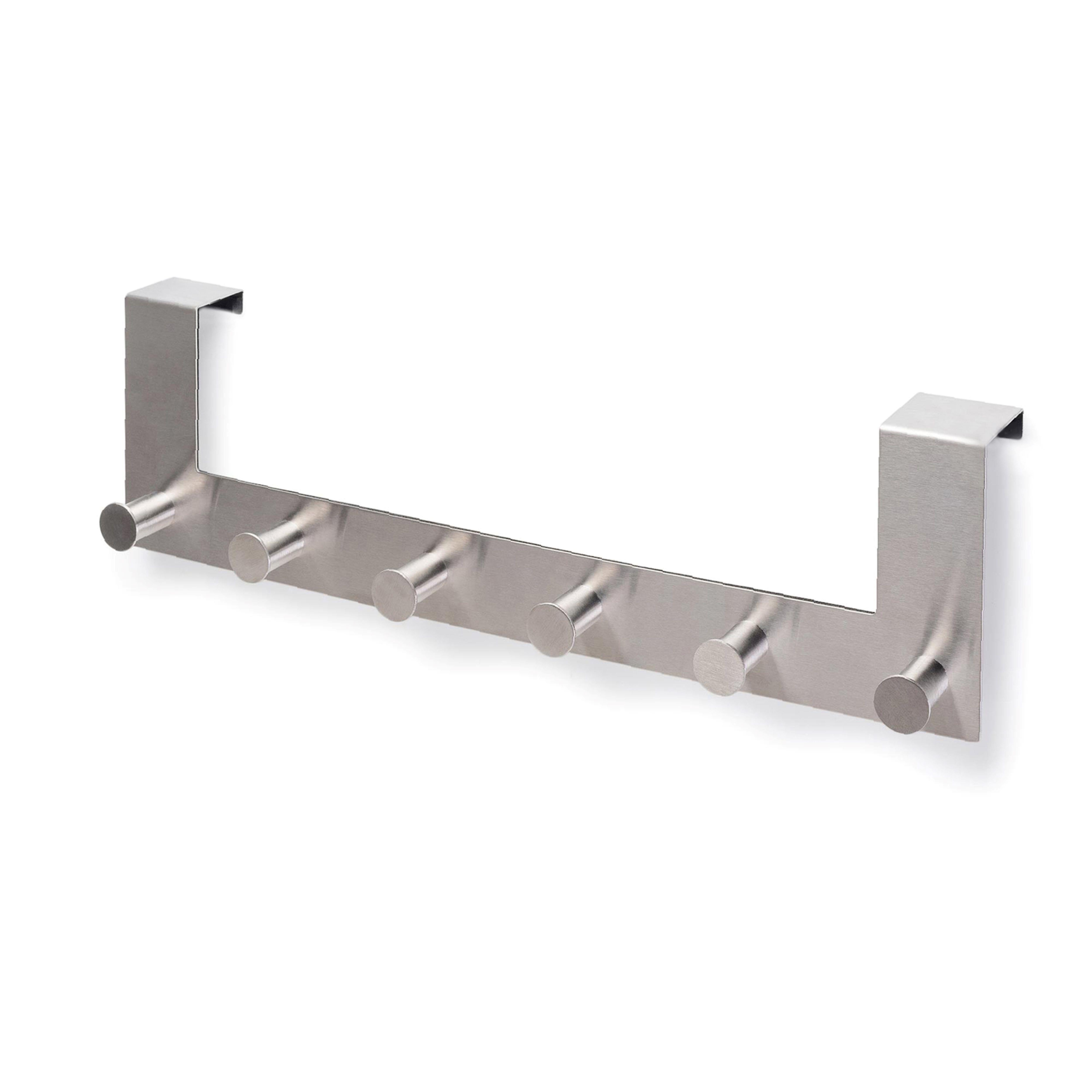 Perchero con 6 ganchos para instalar sobre puerta, de estilo contemporáneo y moderno. Muy versátil e ideal para integrar en todo tipo de estancias y con distintos estilos decorativos. Fabricado en acero en acabado acero. Medidas 395x110x50mm