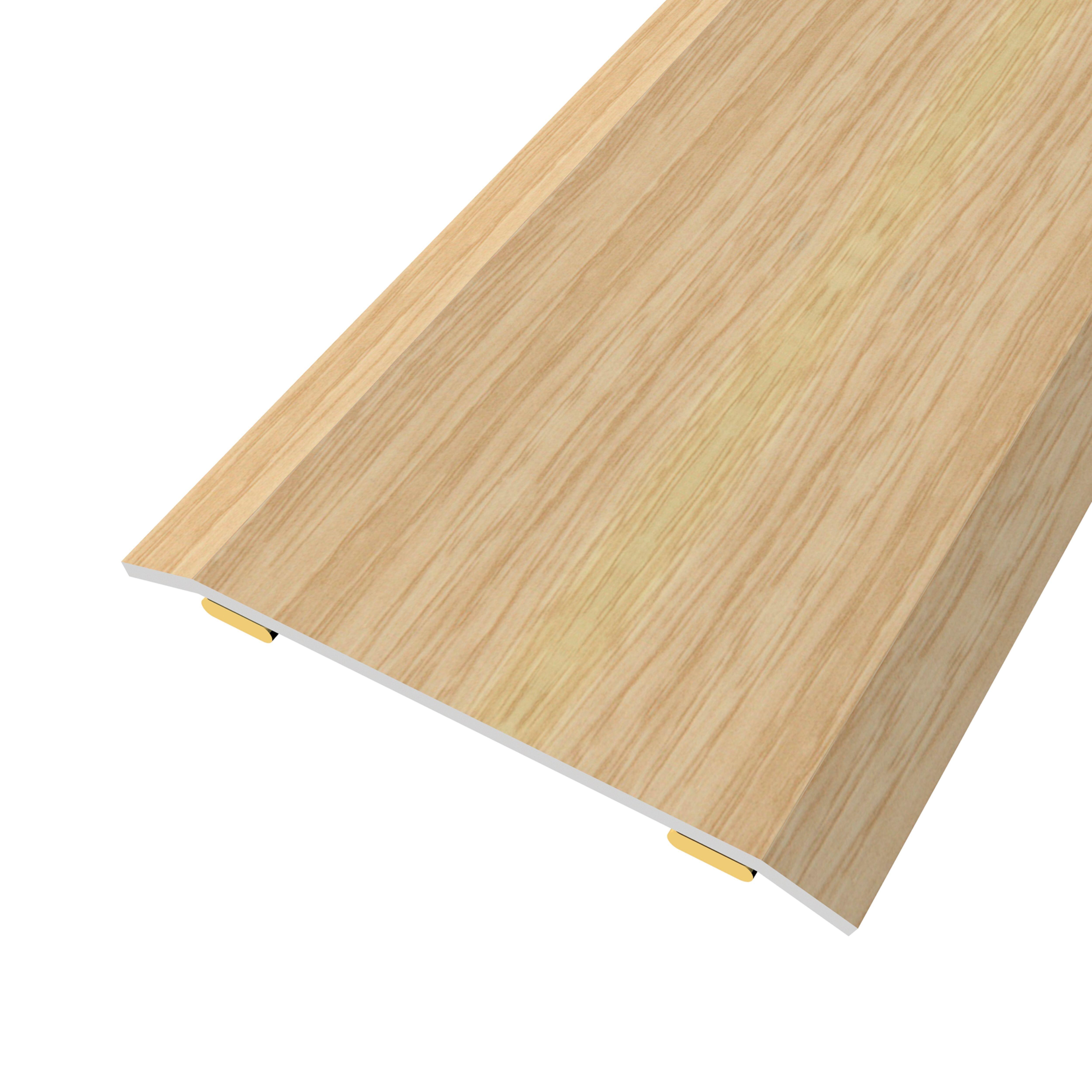 Perfil de transición adhesivo de acero en color roble claro, medida de 83cm de longitud.