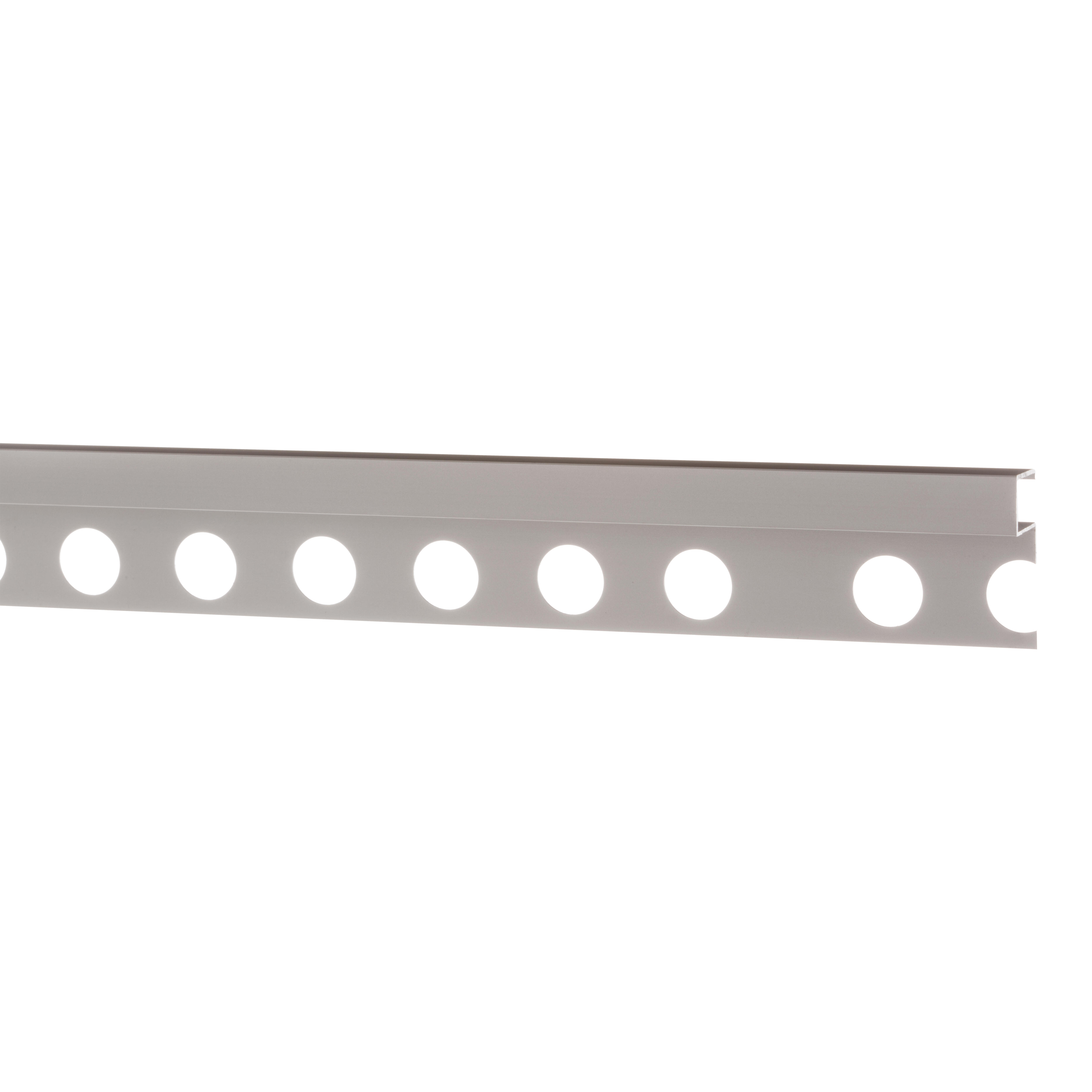 Perfil redondeado para esquina de aluminio de aleación 6063 anodizado en color plata mate de 10,5 mm de altura, diseñado para su instalación en esquinas de revestimientos cerámicos. Este perfil aporta un acabado redondeado a la esquina, evitando aristas peligrosas y protegiendo las piezas de revestimiento frente al desgaste producido por roces y pequeños golpes. Perfil dotado de solapa troquelada para su fácil instalación. La solapa, al disponer de troqueles redondos por los que pasa el material de agarre del revestimiento, permite que el listelo quede firmemente fijado.