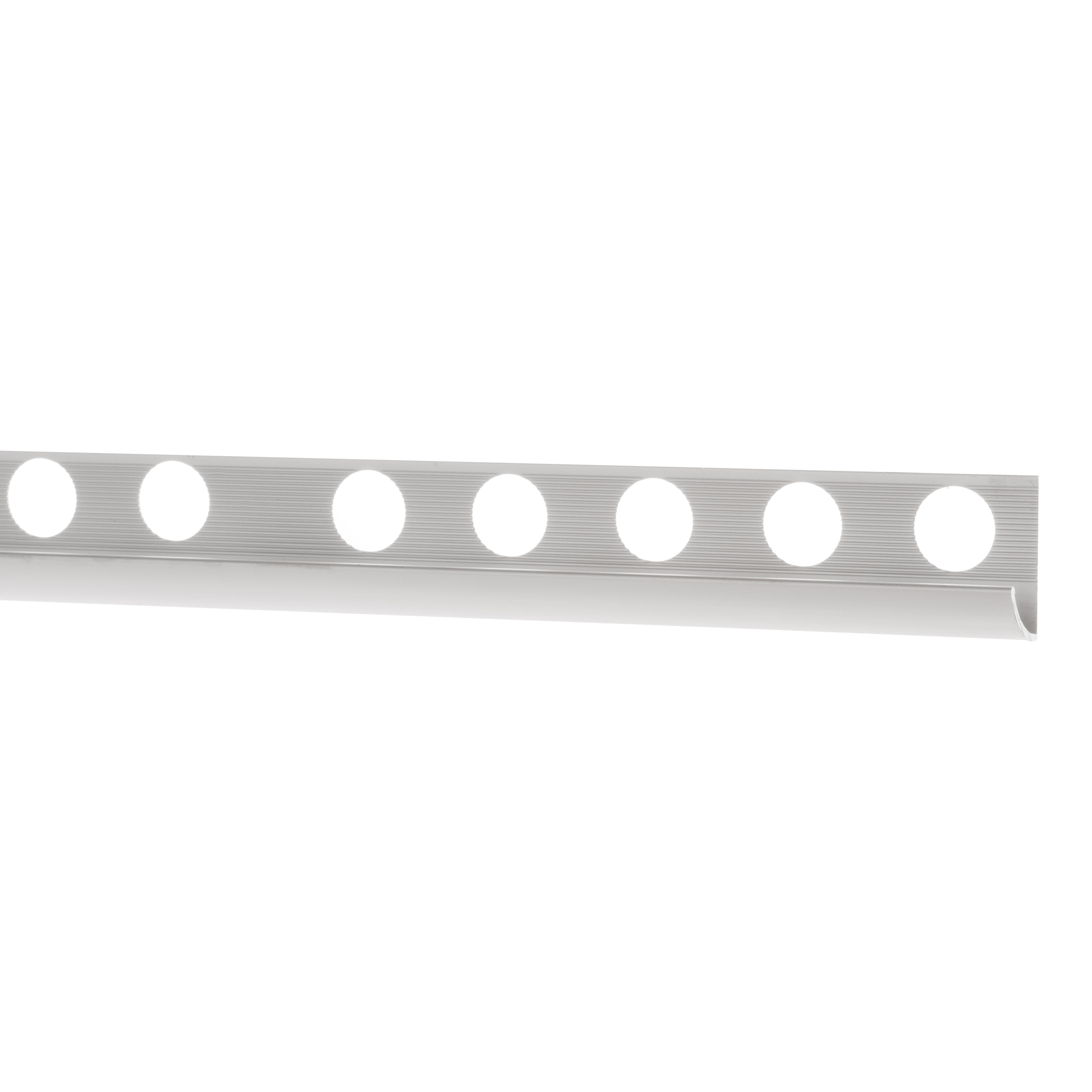 Perfil redondeado para esquina de aluminio de aleación 6063 anodizado en color plata mate de 10,5 mm de altura, diseñado para su instalación en esquinas de revestimientos cerámicos. Este perfil aporta un acabado redondeado a la esquina, evitando aristas peligrosas y protegiendo las piezas de revestimiento frente al desgaste producido por roces y pequeños golpes. Perfil dotado de solapa troquelada para su fácil instalación. La solapa, al disponer de troqueles redondos por los que pasa el material de agarre del revestimiento, permite que el listelo quede firmemente fijado.