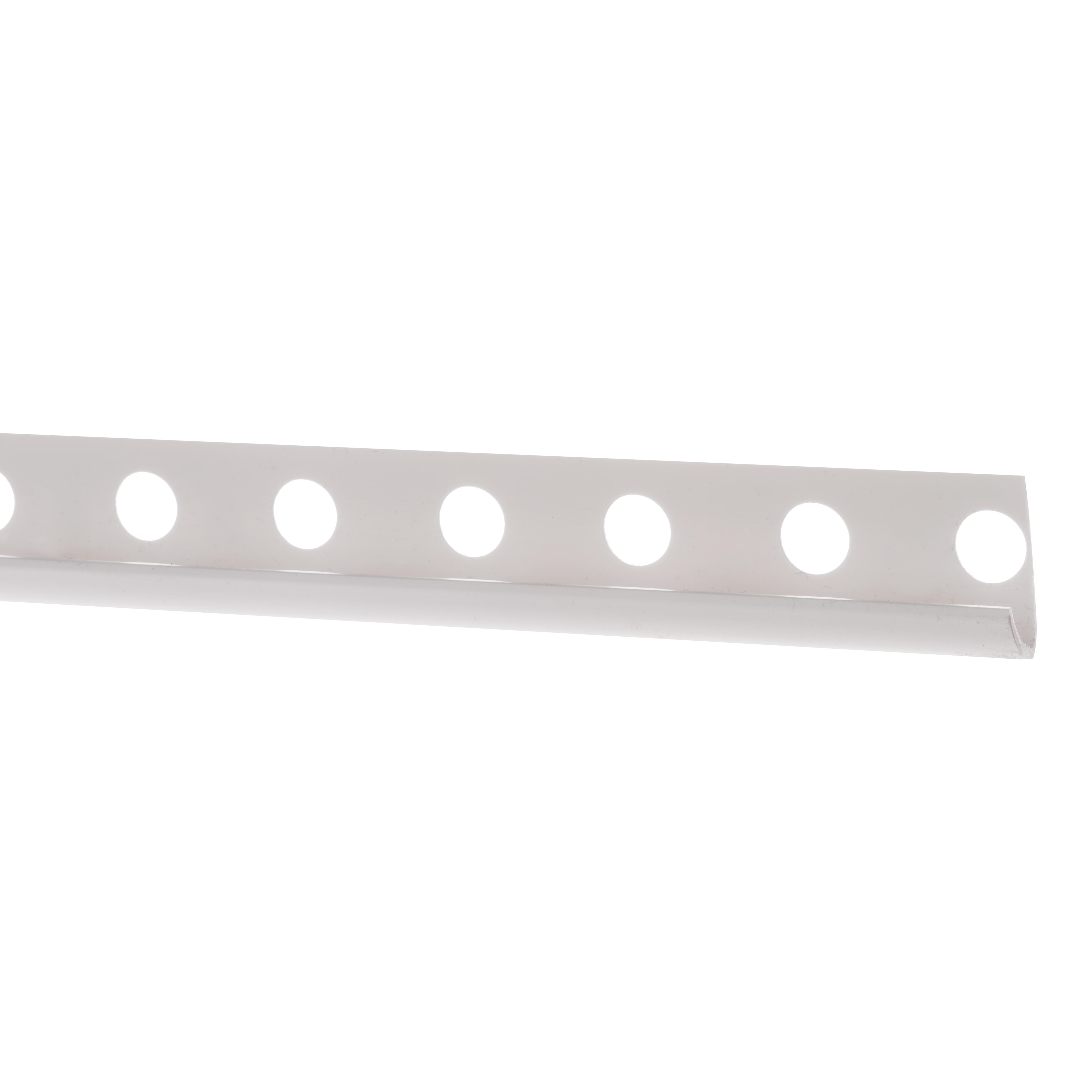Perfil redondeado para esquina de PVC de color blanco de 10,5 mm de altura, diseñado para su instalación en esquinas de revestimientos cerámicos. Este perfil aporta un acabado redondeado a la esquina evitando aristas peligrosas y protegiendo las piezas de revestimiento frente al desgaste producido por roces y pequeños golpes. Perfil dotado de solapa troquelada para su fácil instalación. La solapa, al disponer de troqueles redondos por los que pasa el material de agarre del revestimiento, permite que el listelo quede firmemente fijado.