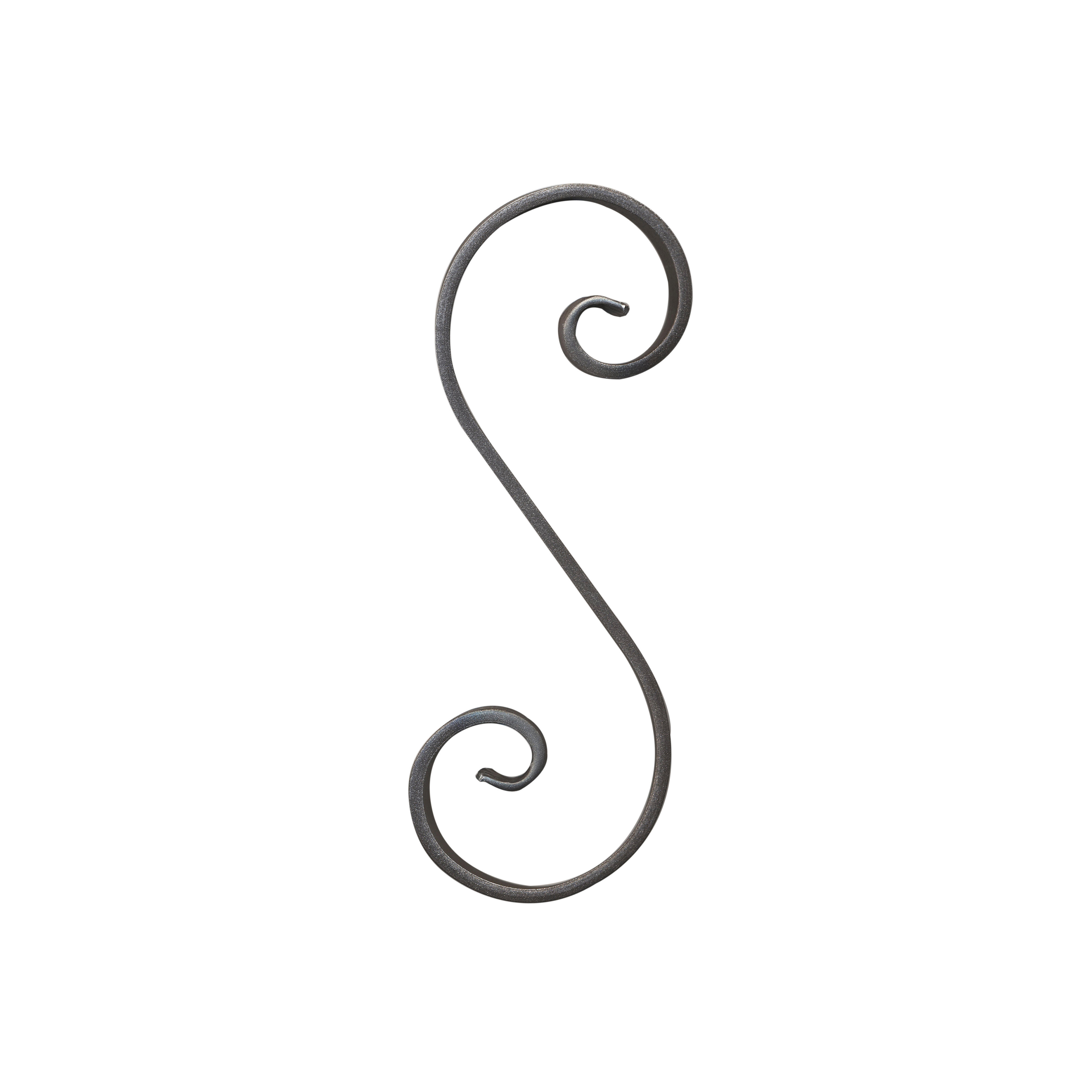 Perfil hierro forjado rizo en forma de S con medidas de alto 270mm, ancho 100mm y sección 12x6mm.