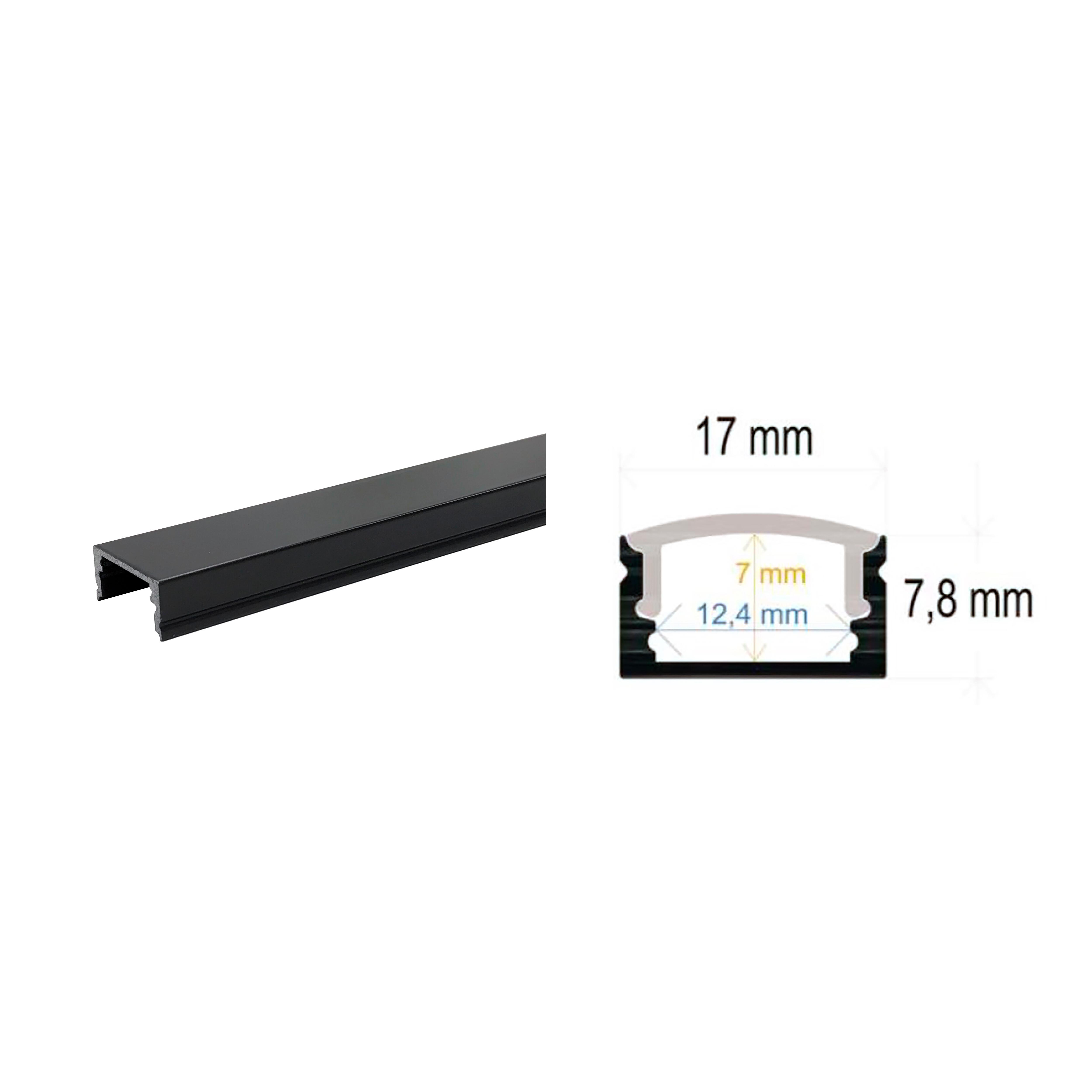 Perfil tira led de superficie, acabado en aluminio anodizado negro. Medidas 17x8mm y longitud de 2m. Cuerpo de aluminio y difusor de PVC.
