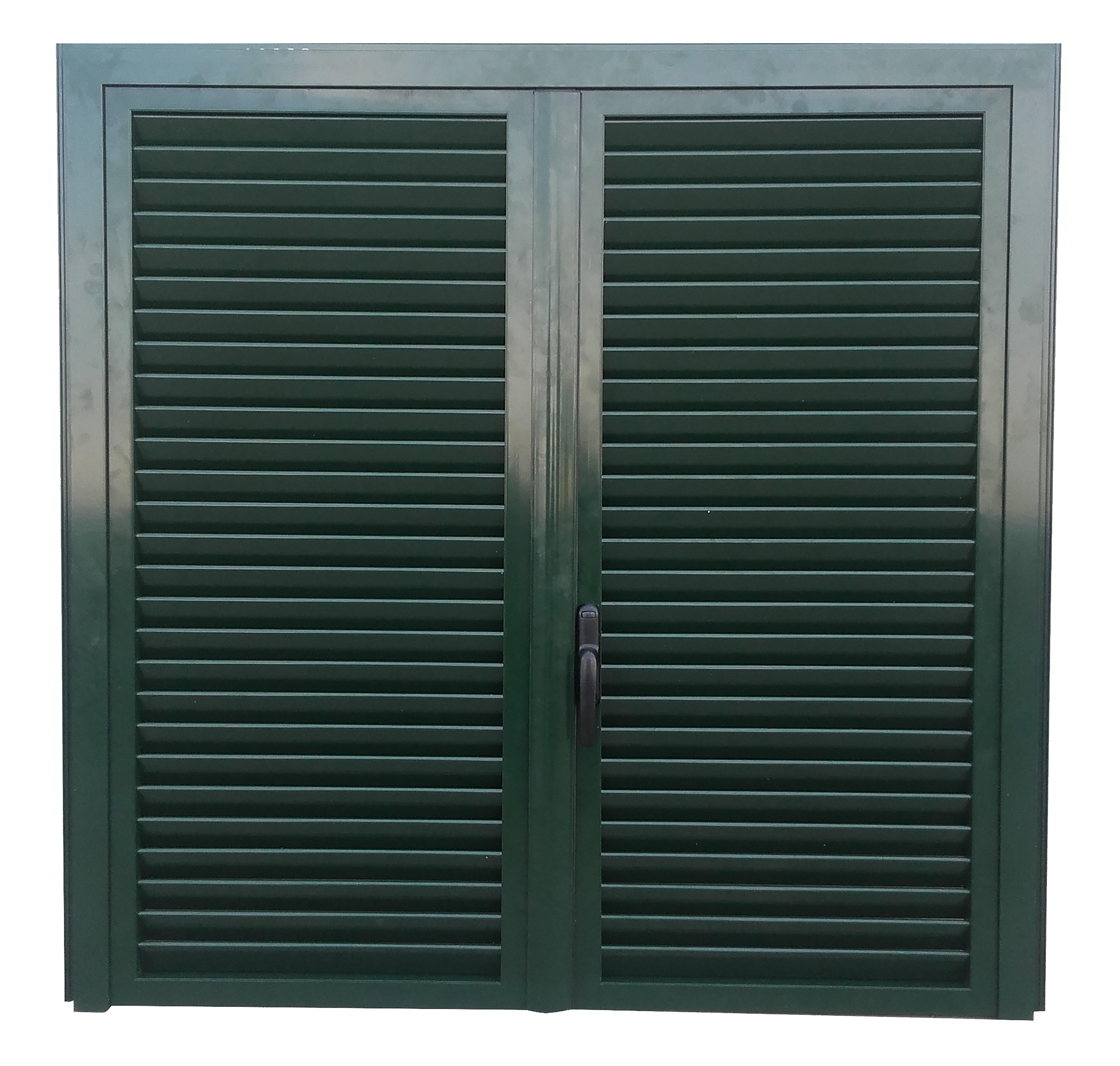 Fabricada en aluminio lacado Qualicoat verde tanto marco (40 mm) como lamas. Cierre de maneta con apertura practicable hacia el exterior.