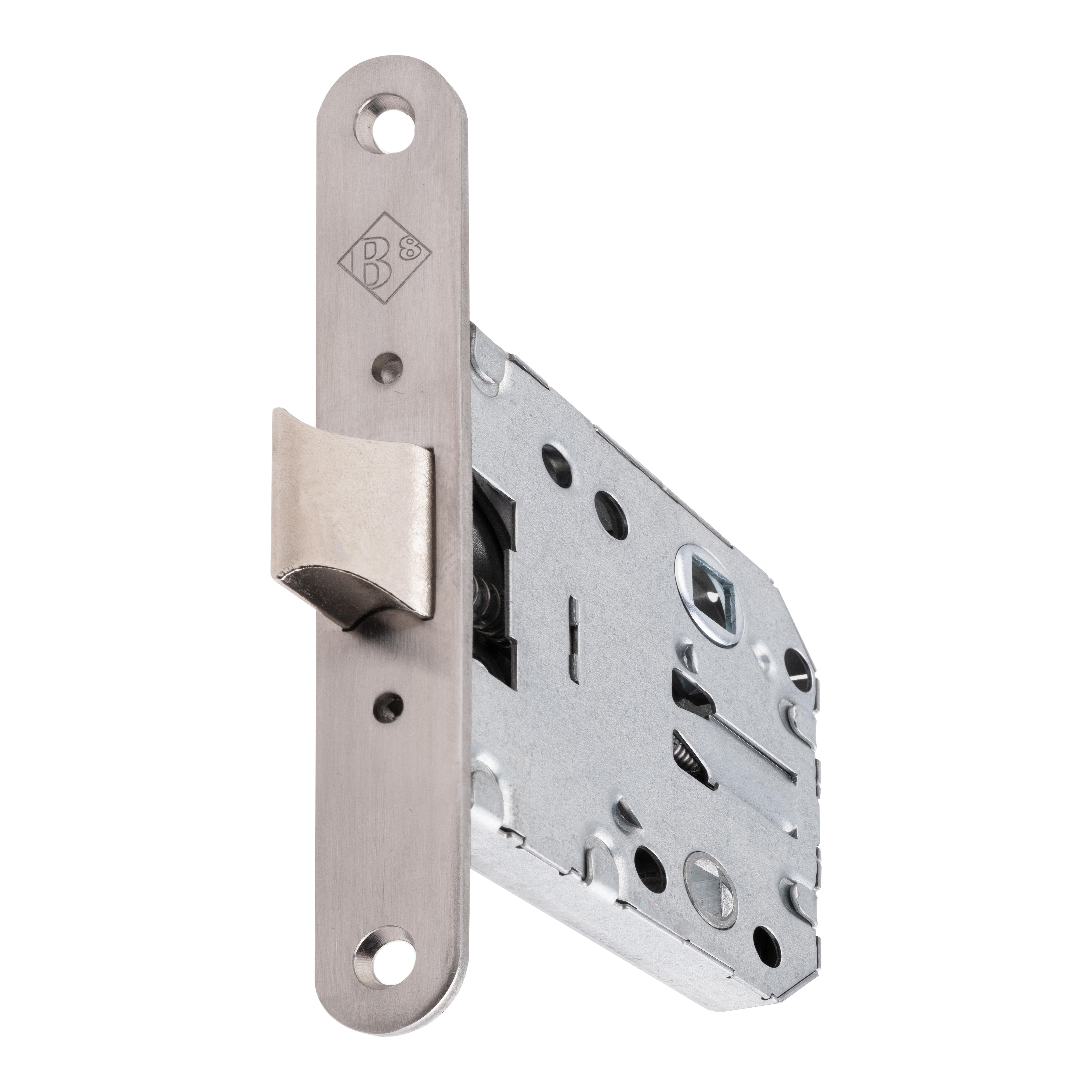 Picaporte unificado 247 con condena incorporada reversible. Entrada 50 mm, canto redondo. Acabado acero inoxidable.
