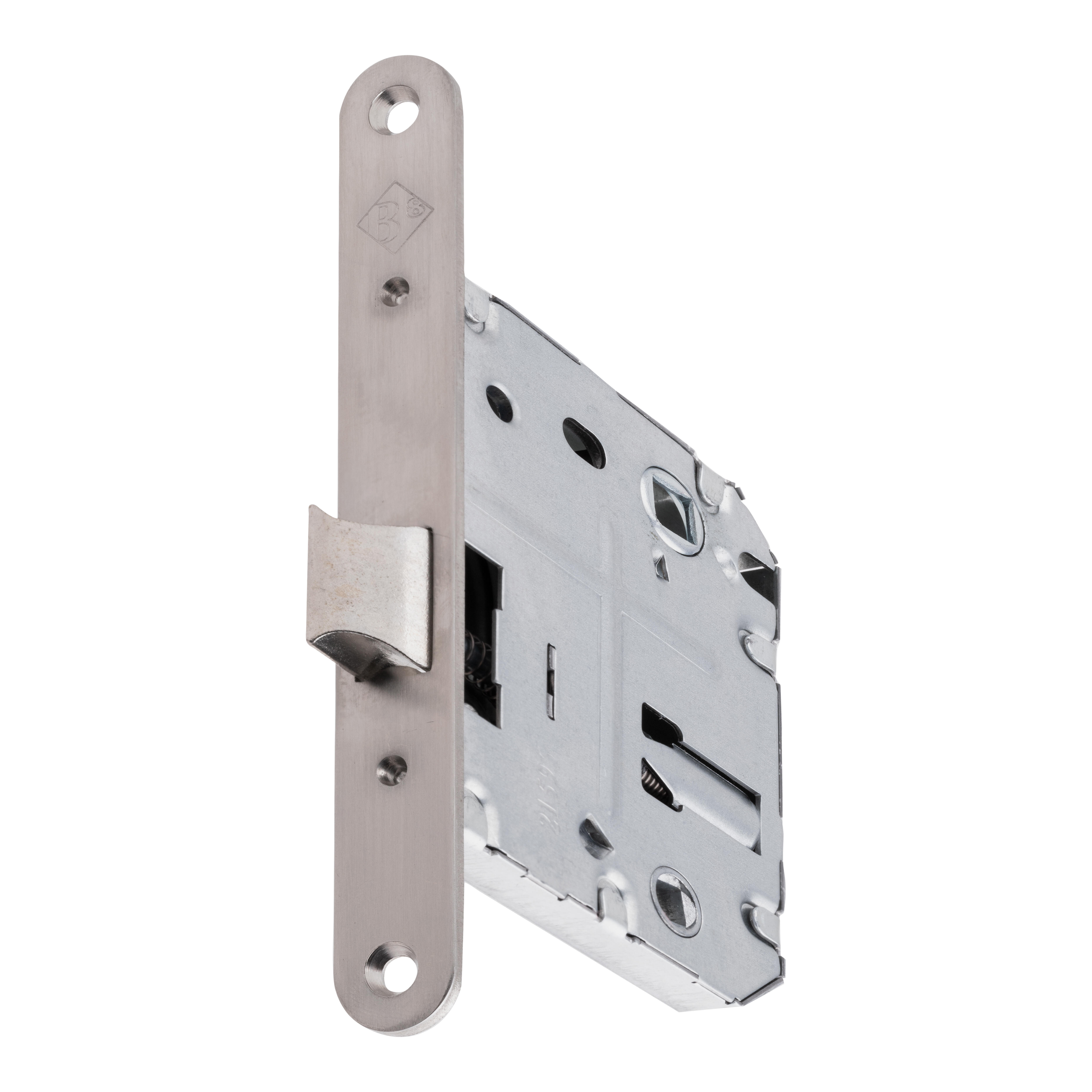 Picaporte unificado 270 con condena incorporada reversible. Entrada 50 mm, canto redondo. Acabado acero inoxidable.