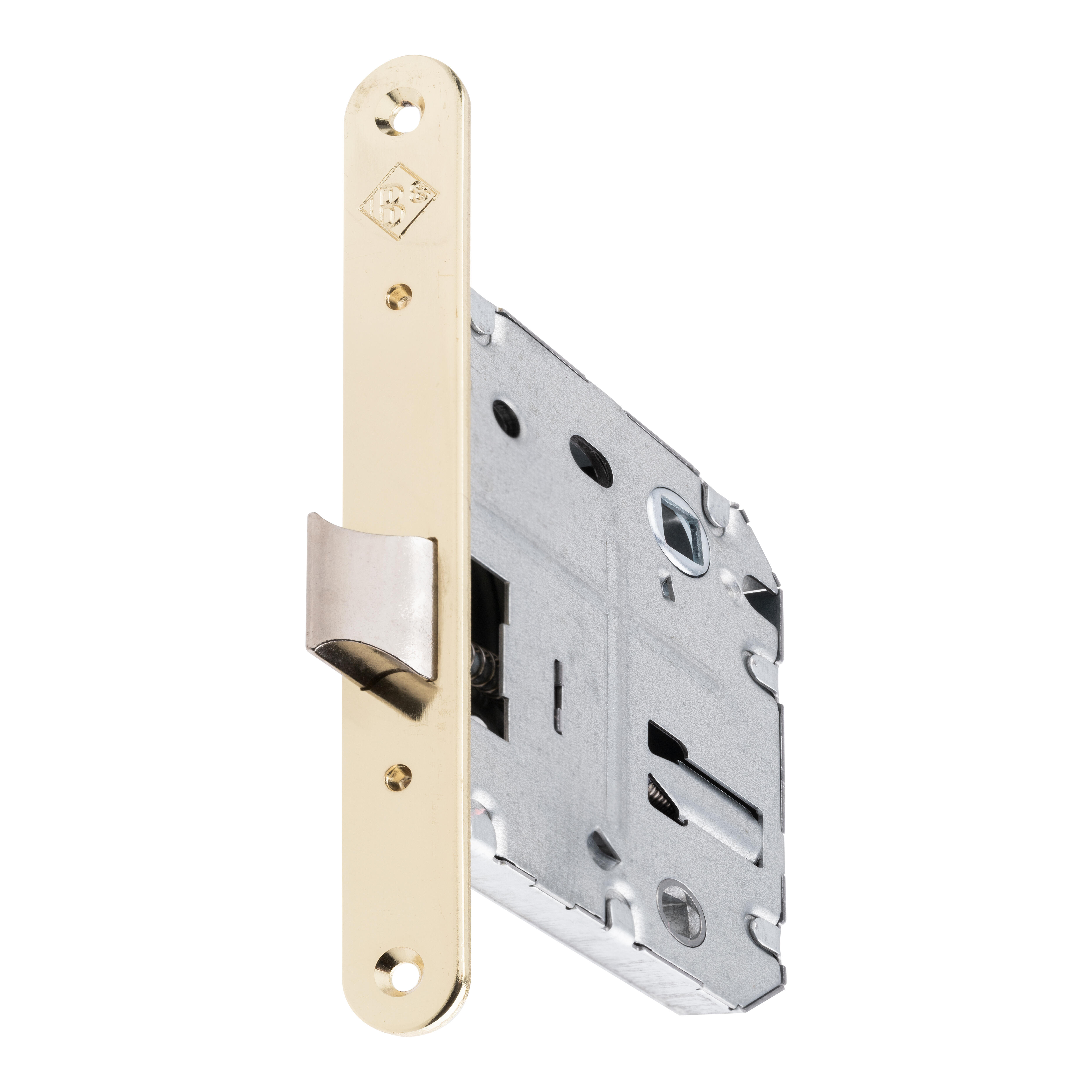Picaporte unificado modelo 270. Distancia 70 mm Entrada 50 mm. Canto redondo. Reversible. Acabado latonado