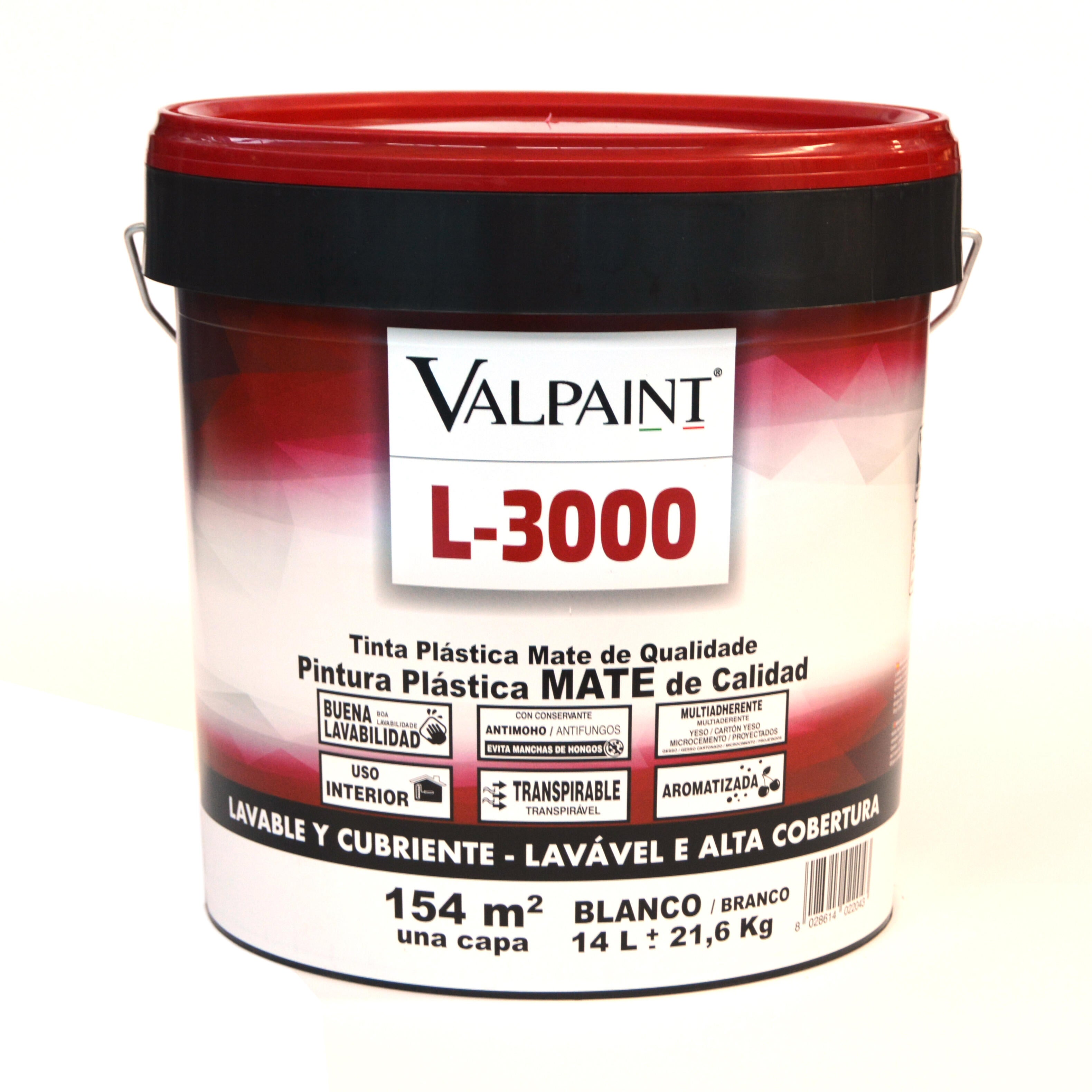 Pintura plástica blanca con acabado mate, de 14l L3000. Uso interior y exterior. Rendimiento: 9-10m2/l. Indicada para el pintado de paredes, techos, fachadas, soportes de yeso y albañilería en general.